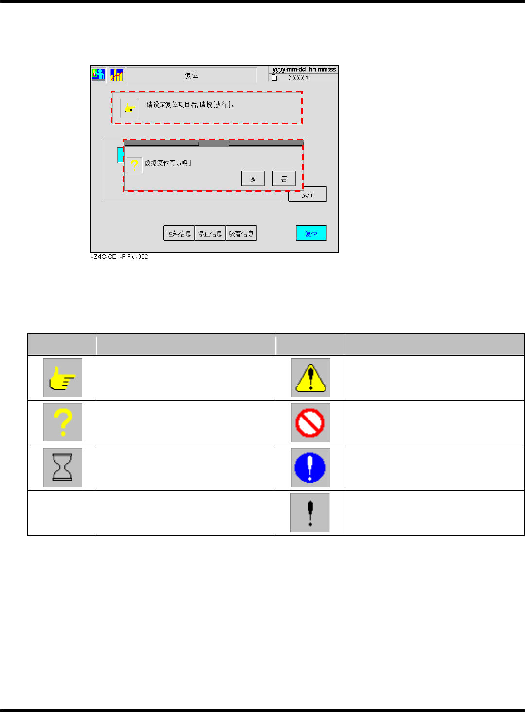 CM101-D 操作手册 1.3 主菜单 Pa ge 1- 10 1.3 主菜单 通知 本机可自由变更操作员模式的菜单构成。 ( 参考手册 ) 操作员模式 说明 表示操作员模式。 检查时期的显示栏 • 接近检查时期时 ( 周期的 90%) ,信息就显示 为绿色。超过检查时期 就显示为黄色。 ∗ 显示信息时,请进行检 查。 ( 维修手册 ) 图标开关 • 按框内的图标就会显示 各项目的菜单画面。 工程师模式 说明 …