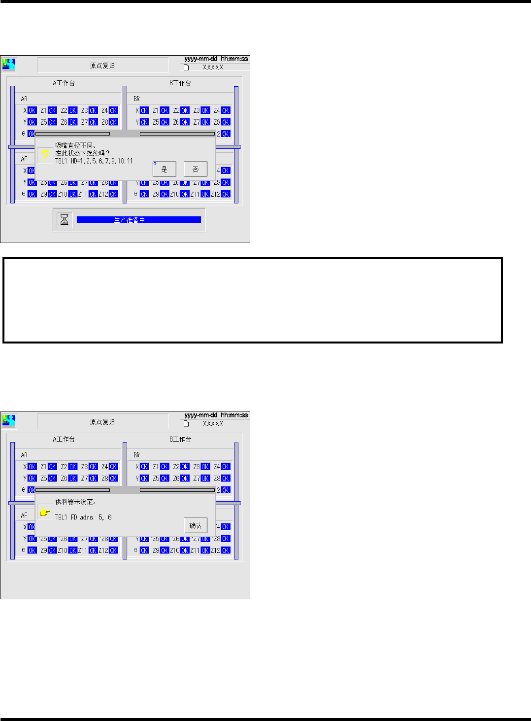 CM101-D 操作手册 2.3 生产开始 Pa ge 2- 10 关于在原点复归动 作中显示的信息 ① 自动运转前的吸嘴确认动作中,吸嘴直径不同时 • 此时,将会显示是否要 继续生产的确认信息。 另外,当位置偏移量超 出范围时也会显示同样 的信息。 ( 使用多功能吸头时不显示 。 ) 要求 吸嘴位置偏移量错误的原因可能是吸嘴的污垢、破损以及吸嘴汽缸轴的弯曲等。 请在生产设定菜单画面中选择吸嘴设定后进行吸嘴确认动作后,通过偏移值及识…