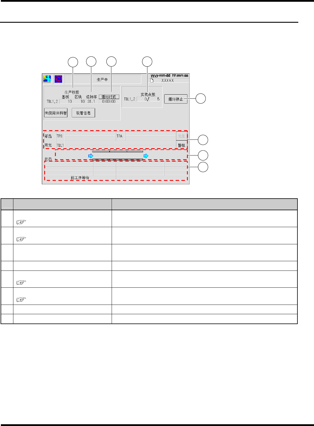 CM101-D 操作手册 2.4 生产中 Pa ge 2- 12 2.4 生产中 2.4.1 生产中的信息与功能 显示基本的生产信息、 元件用完的供料器地址、运 转情况。 No. 名称 说明 ‘ 生产枚数 ’ ( 参考手册 ) 生产的基板数及区块数 ‘ 运转率 ’ ( 参考手册 ) 本机的运转率 循环时间 指从基板加载到实装工 作台上到实装已结束的该基 板开始卸载之间所需 的时间。 ‘ 实装点数 ’ 指在当前为止实装完毕…