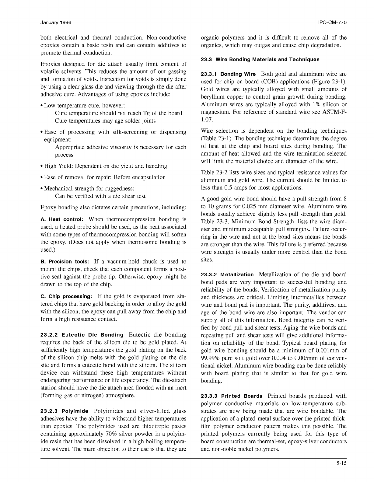 IPC-CM-770 Januaty 1996 1 O0 70 30 20 :: 10 I O J v: I 1980 1985 19 'NON-IBM YEAR OTHER GOLD BALL BONDING 73% AI BAL L 3'1" ALUMINUM WEbGE BONDING 22% i% t 2 2% I IPC-1-00338 Figure 23-1 Chip Termination T…