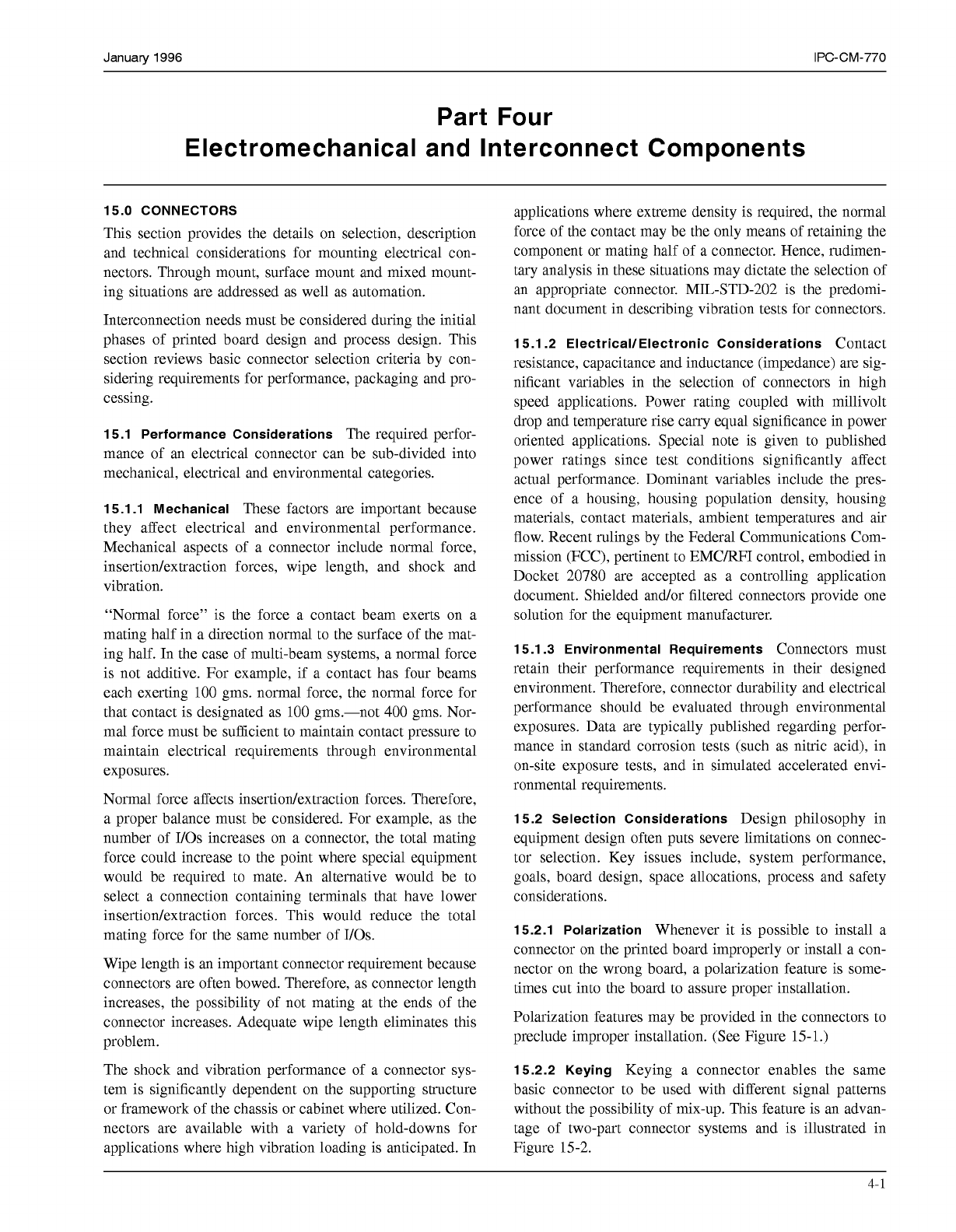 January 1996 IPC-CM-770 Part Four Electromechanical and Interconnect Components 15.0 CONNECTORS This section provides the details on selection, description and technical considerations for mounting electrical con- nector…