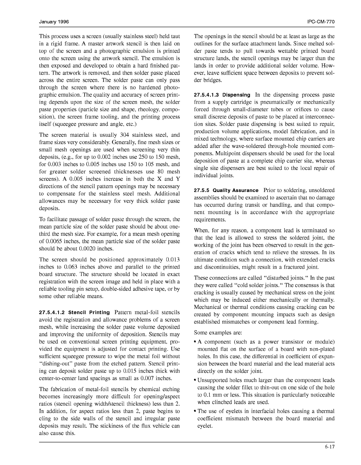 IPC-CM-770 Januaty 1996 Care should be taken in clinching leads to ensure that the stress-relief bends are not reduced by straightening. Parts which generate heat, if mounted directly on the board, can cause locally seve…