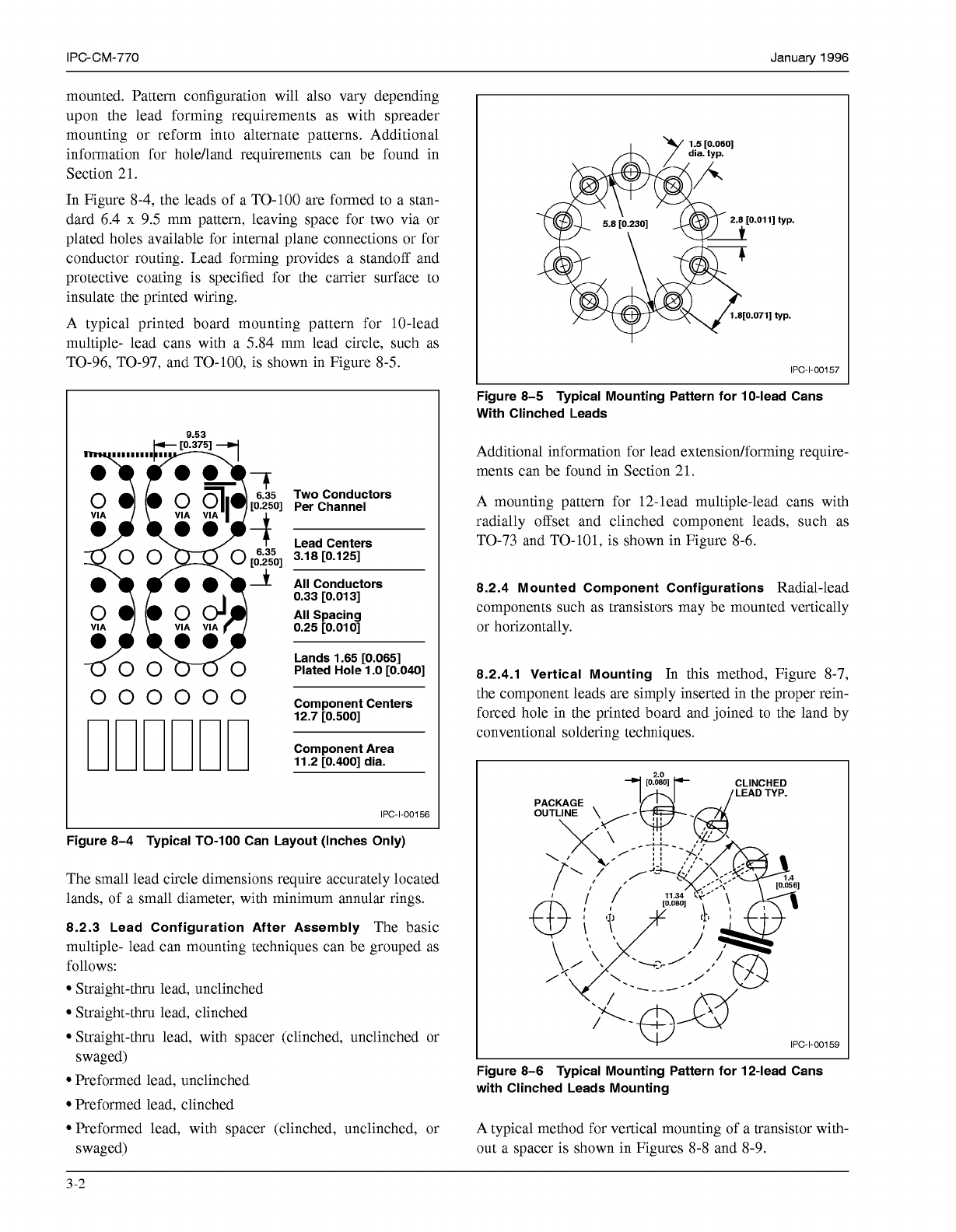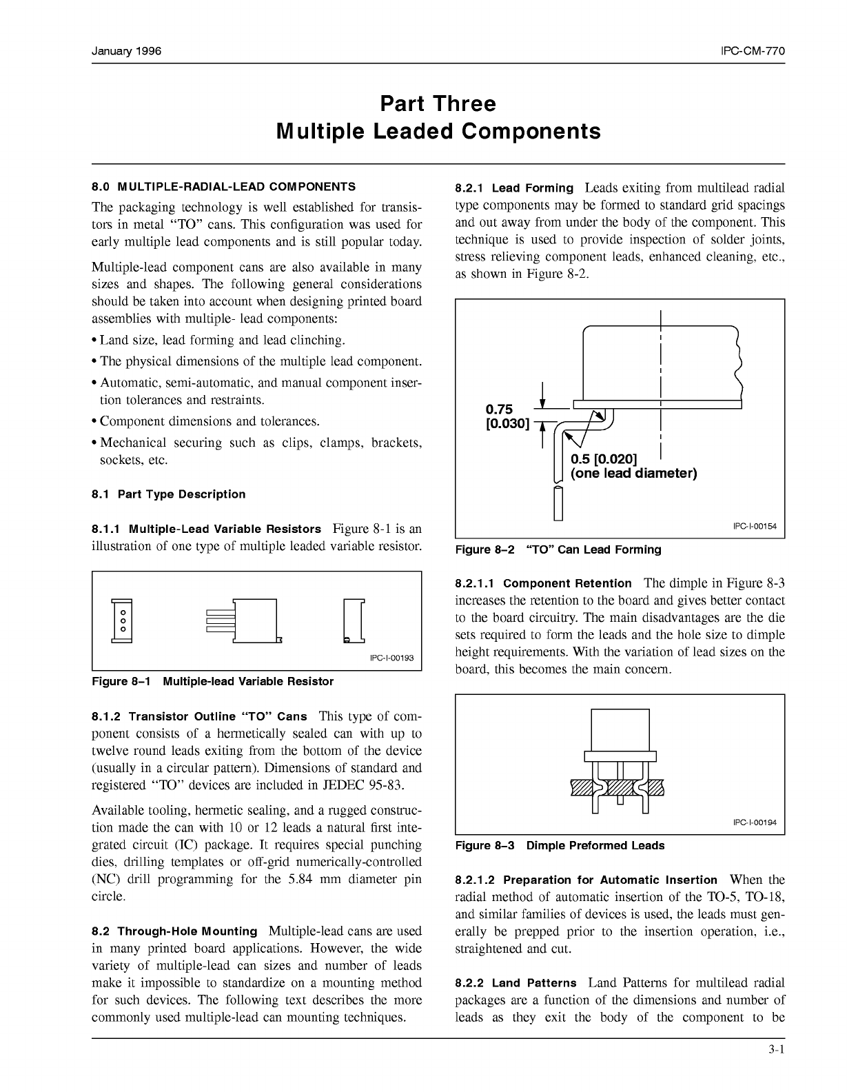 January 1996 IPC-CM-770 Part Three Multiple Leaded Components 8.0 MULTIPLE-RADIAL-LEAD COMPONENTS The packaging technology is well established for transis- tors in metal “TO” cans. This configuration was used for early m…