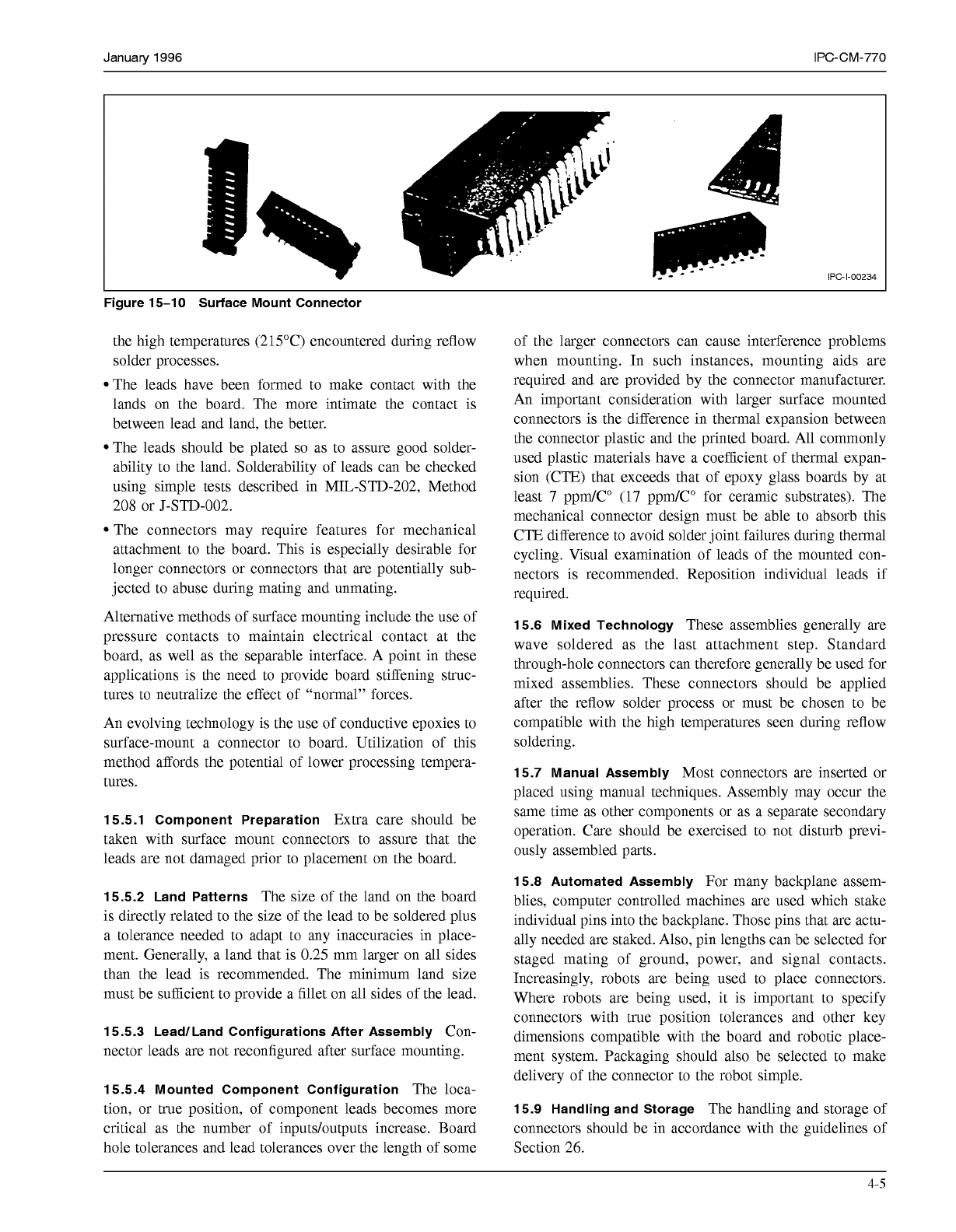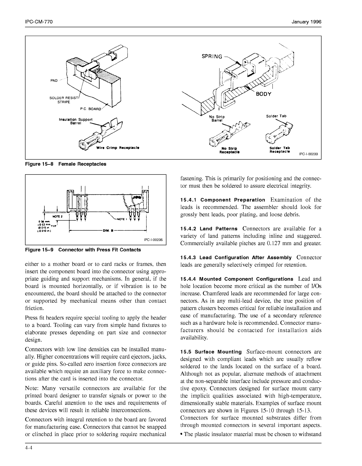 IPC-CM-770 Januaty 1996 lnrulallon Support Wir. Crimp Rac*ptmclo IPC-1-00233 Figure 15-8 Female Receptacles IPC-1-00235 I Figure 15-9 Connector with Press Fit Contacts either to a mother board or to card racks or frames,…