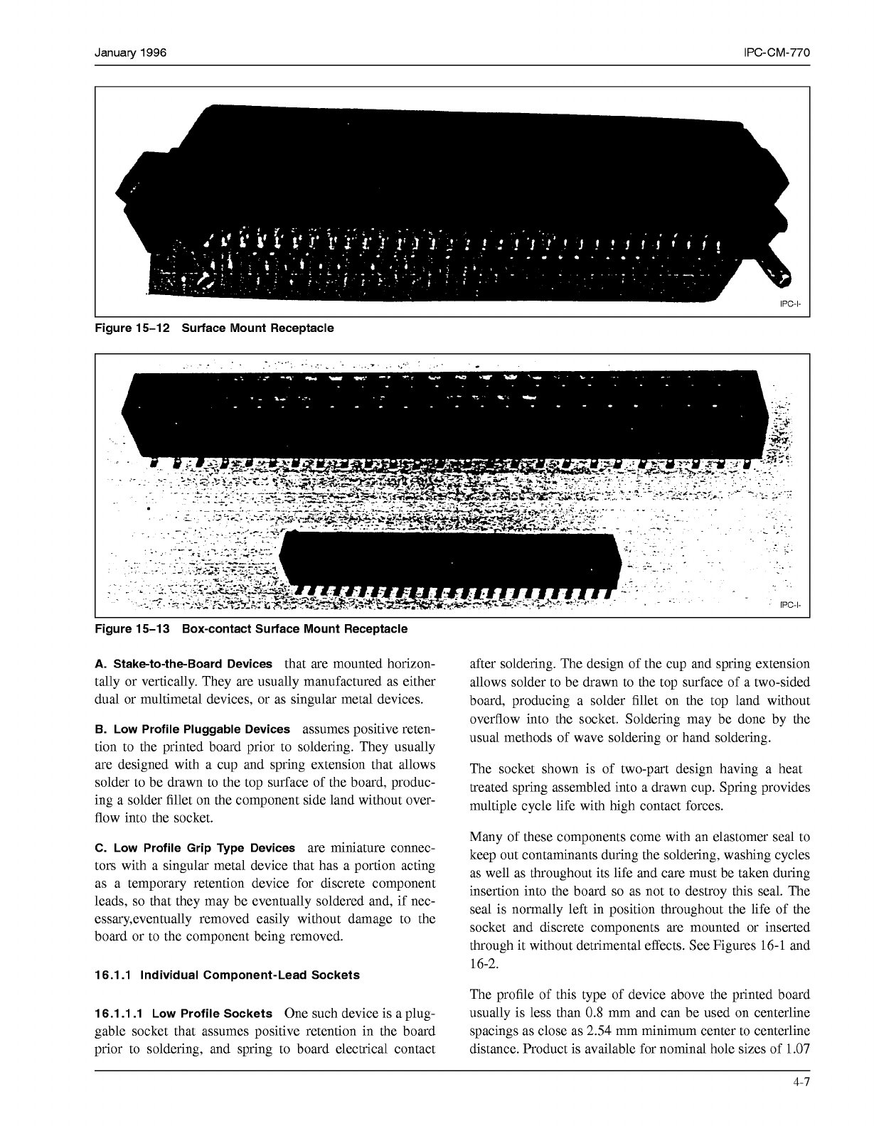 January 1996 IPC-CM-770 Figure 15-1 2 Surface Mount Receptacle Figure 15-1 3 Box-contact Surface Mount Receptacle A. Stake-to-the-Board Devices that are mounted horizon- tally or vertically. They are usually manufactured…