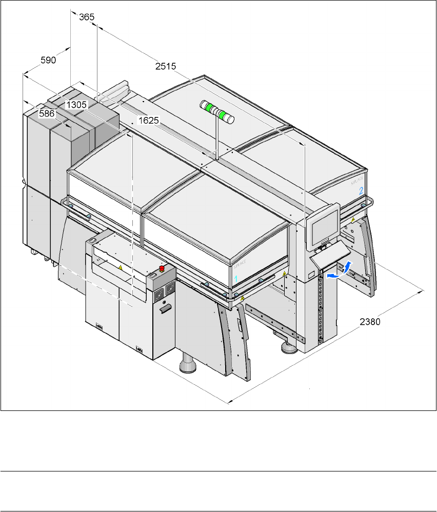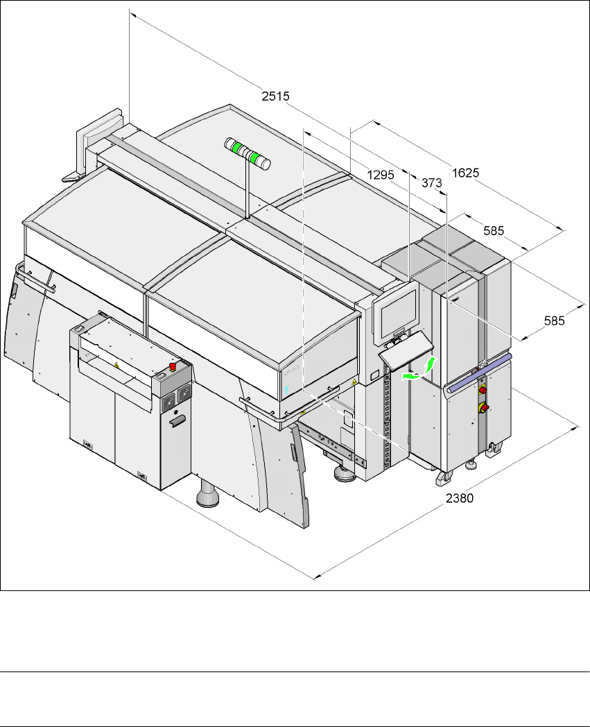 SIPLACE HF 系列使用手 冊 3 技術資料 軟體版本 SR.505.xx 05/2004 中 文版 3.8 取置機的尺寸與重量 119 3.8.7 配備矩陣式料盤更換器的 HF 取置系統的尺寸 3 3 3 3 圖 3.8 - 5 配備矩陣式料盤更換器的 HF 取置系統尺寸 ( 單位為毫米 ) 3 註 3 矩陣式料盤更換器可以靠接在位 置 2 及 4 上來取代料站台車。