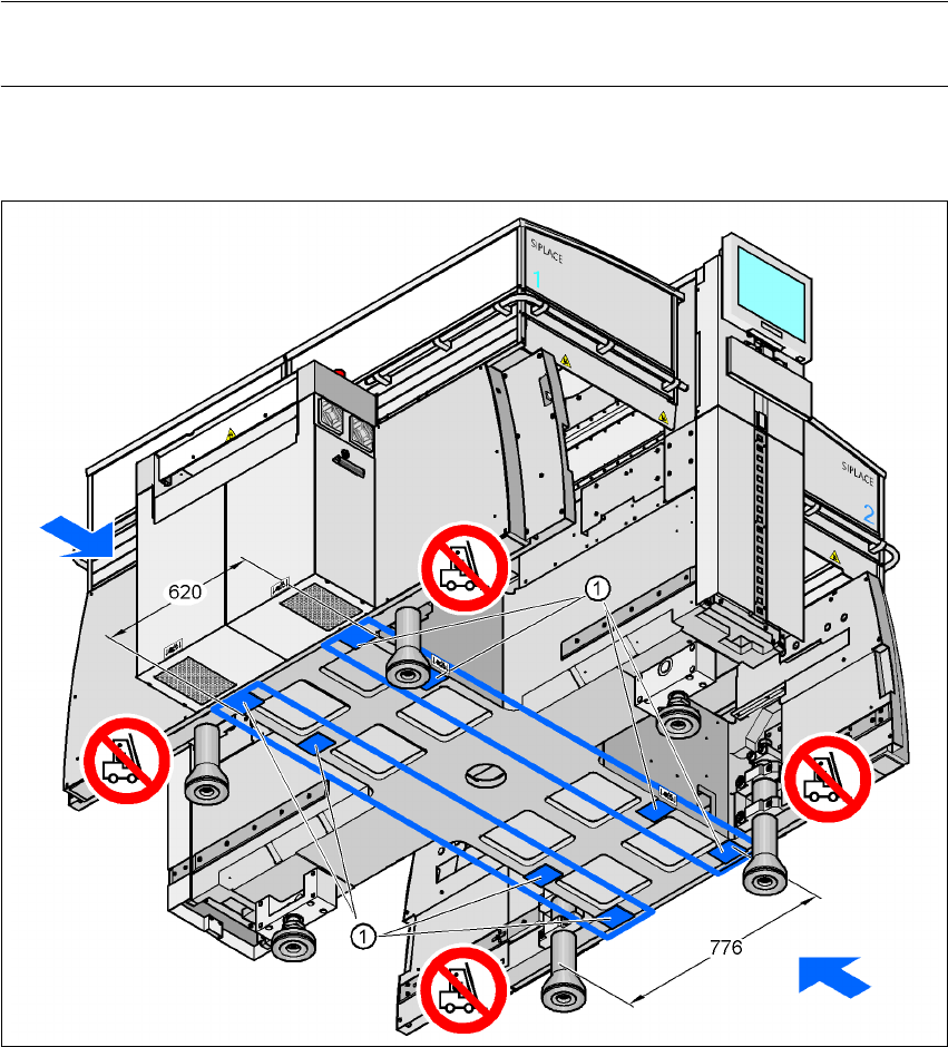 SIPLACE HF 系列使用手 冊 4 組立與啟用 軟體版本 SR.505.xx 05/2004 中 文版 4.3 交貨組態與搬運 151 4.3.4.3 取置機上的叉式堆 高機頂高點 如果您想要從托板上頂高機器或 者不使用托板搬運時 , 請使用下兩個附圖所顯示的取置機上叉式堆 高機頂高點。 4 註 4 長距離搬運時,請隨時使用托板 及叉式堆高機來搬運取置機,以避免損壞 機器。 堆高叉平行於 PCB 輸送 帶 4 4 圖 4.3 - …