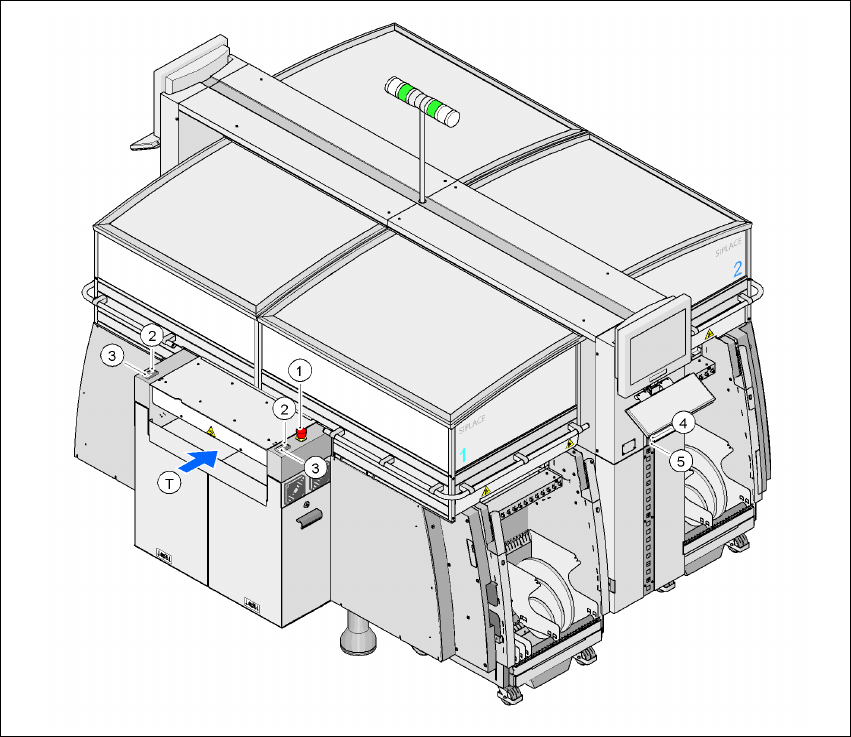 SIPLACE HF 系列使用手 冊 2 操作安全須知 軟體版本 SR.505.xx 05/2004 中 文版 2.6 安全配備 57 2.6.2 取置機上的開關及按鈕 2.6.2.1 取置機上的開關及 按鈕的位置 2 圖 2.6 - 3 開關與按鈕位置-由 PCB 輸出側檢視 2 (1) 總電源開關 (2) 電源供應裝置側操作面板上的停止鈕 ( 黑色 ) (3) 電源供應裝置側操作面板上的啟動鈕 ( 白色 ) (4) 電源供應裝置側操…