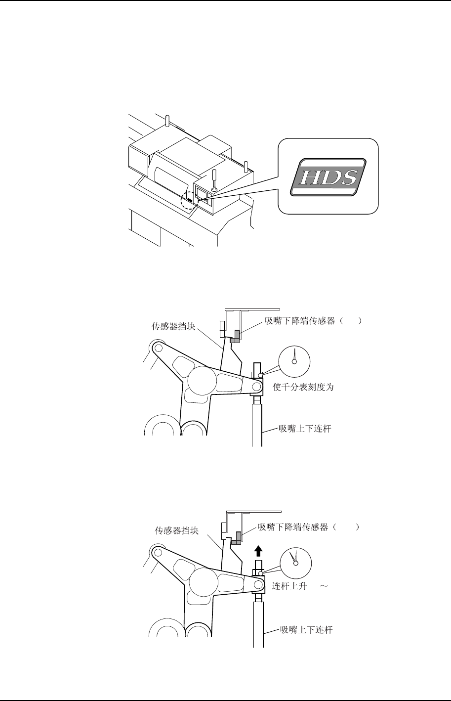 6. 边看千分表边将凸轮轴以正方向旋转,使吸嘴上下连杆上升。确定传感器的安装位置,