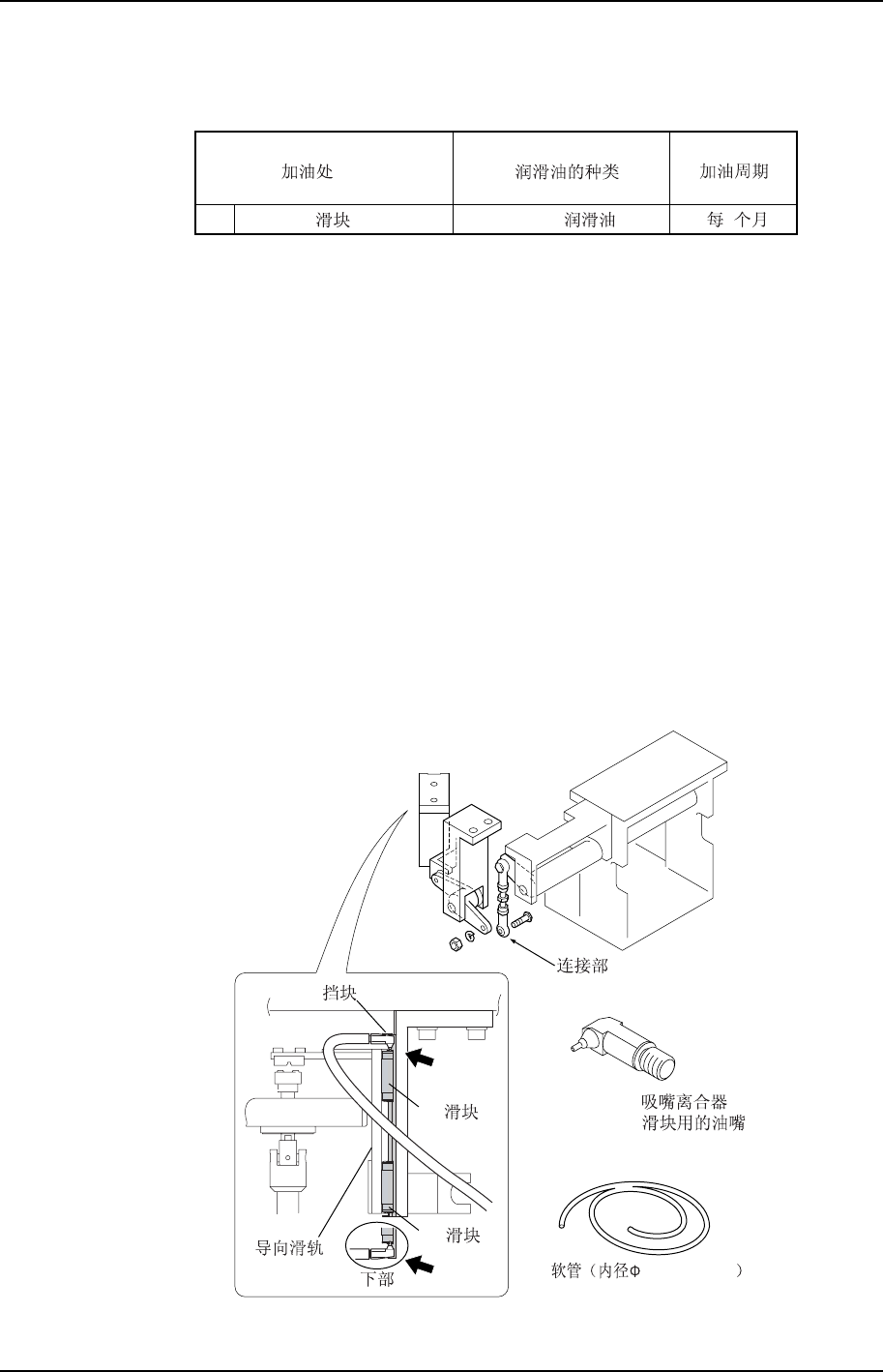 提起导向滑轨,将油嘴插入 LM 滑块的加油口。在导向滑轨和挡块夹住油嘴的状态下