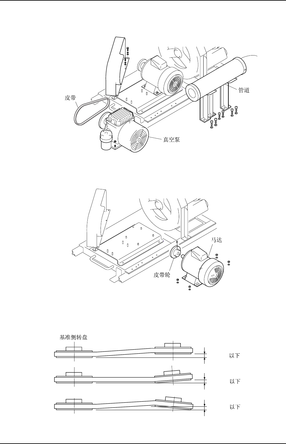 暂时固定住一下即可。调节真空泵与马达之间的距离(在第 2 项的记录值)以及皮带