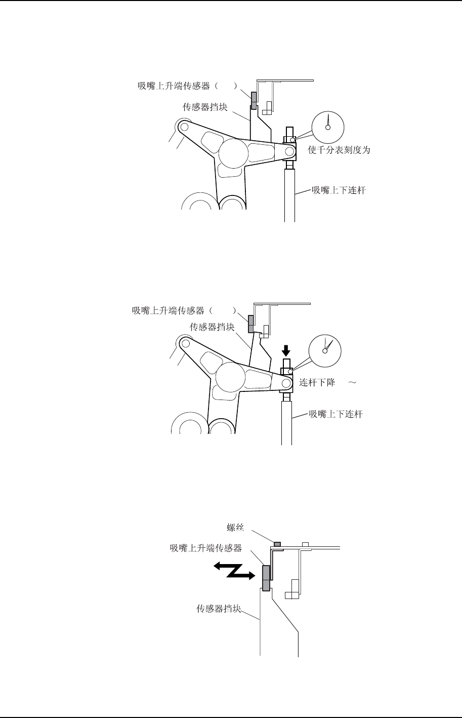 5. 边看千分表边将凸轮轴以正方向旋转,使吸嘴上下连杆下降。确定传感器的安装位置,