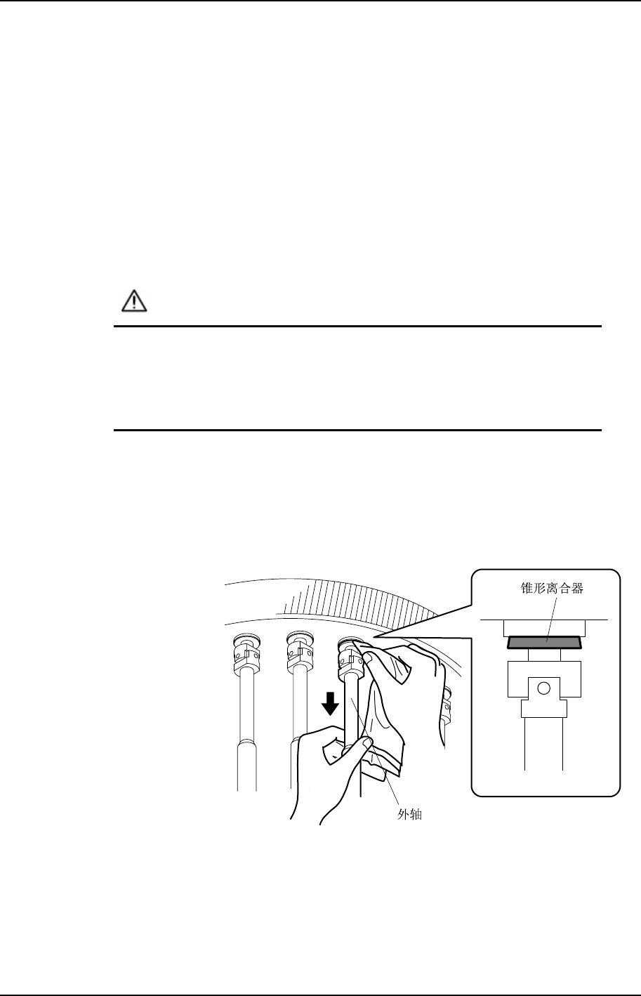 将各吸嘴旋转轴的外轴向下拉,同时用沾有脱脂洗净剂的布擦洗锥形离合器,将其整个一圈