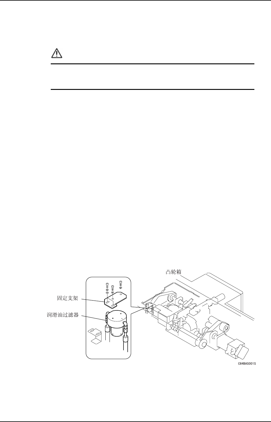 2. 打开凸轮箱上部的门,拆下润滑油过虑器的固定支架。