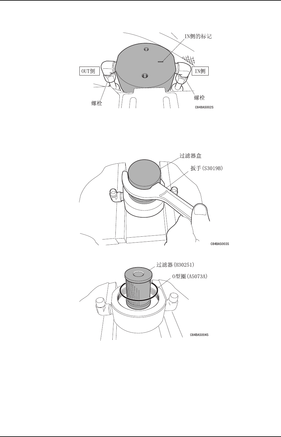 4. 将拆下的润滑油过虑器翻过来,用台虎钳等固定。使用专用扳手打开过滤器盒。
