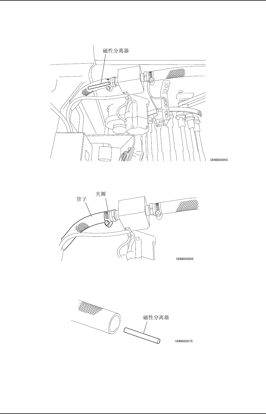 1. 磁性分离器在润滑油管子内(参照下图)。请确认已经放掉了所有的润滑油。