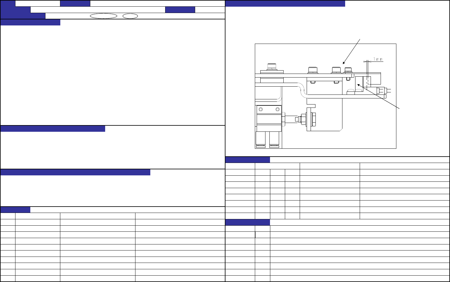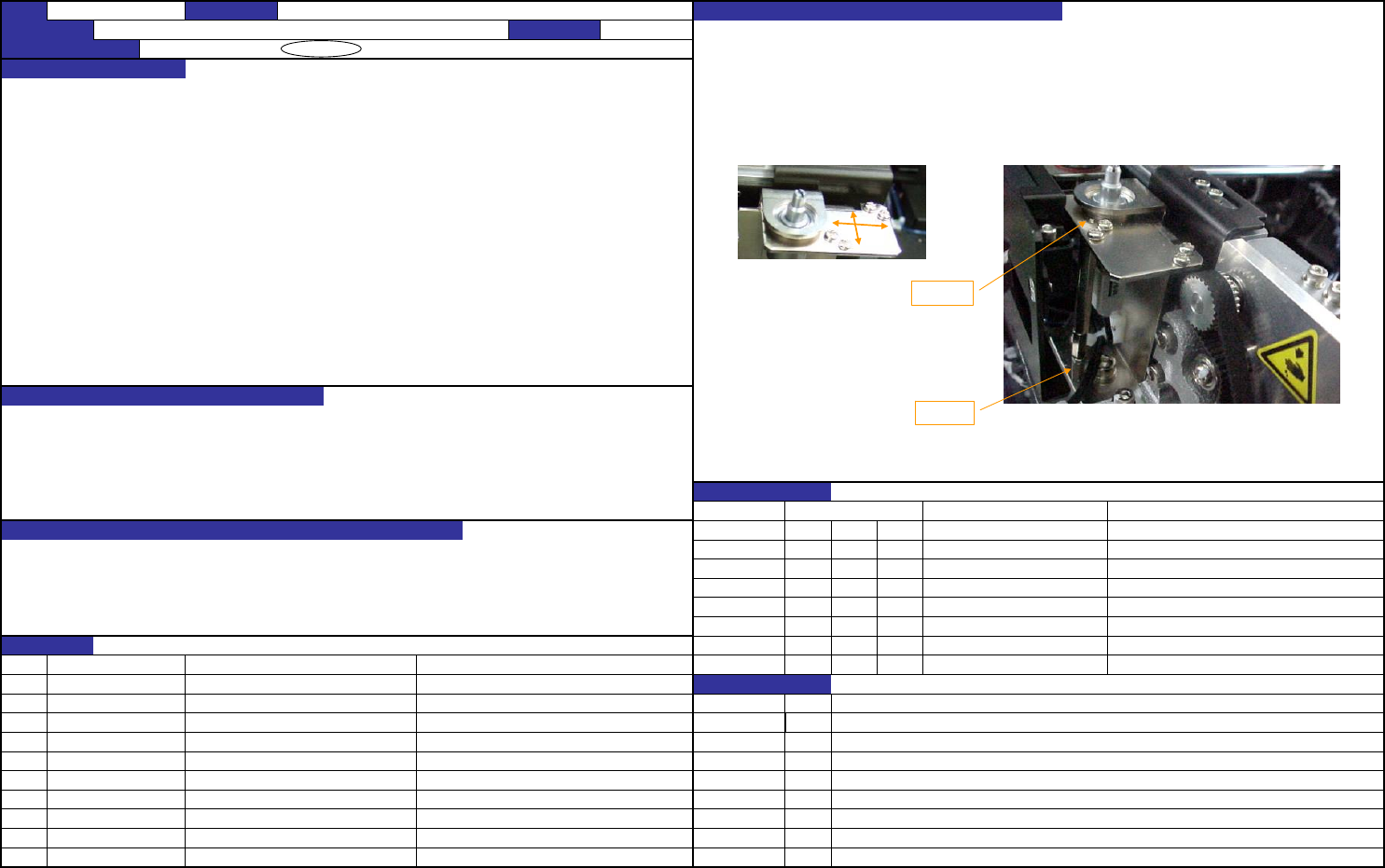 QA表 NO. 1 (1/2) NO. 1 (2/2) 机种 ·在滑动板开,关的状态下,调整传感器配件的位置使其满足各自的规定值, 并用传感器配件紧钉螺钉进行固定。(如下图所示) ·开传感器配件,关传感器配件的固定位置如下所述。 ·在滑动板开关状态的1mm 前传感器ON。(参照右图) 传感器配件紧钉螺钉 ·防止开关时传感器的错误检测。 CDE ·滑动板移动超时错误。 CDE ·吸嘴更换错误。 CDE CDE CDE CDE CDE NO…