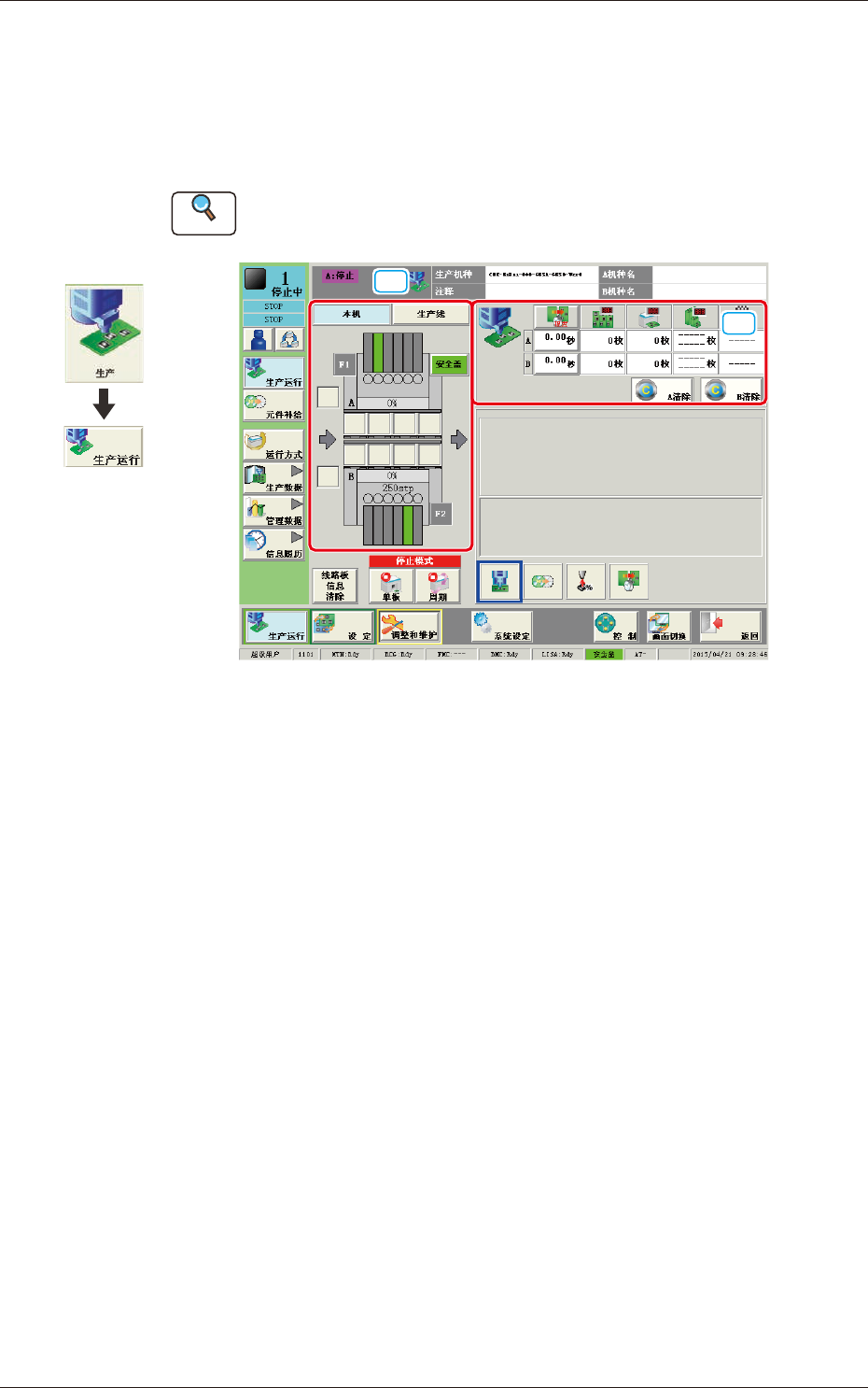 显示生产中的机种 ( 线路板程序 ) 名和生产线路板数等表示当前运行状态和