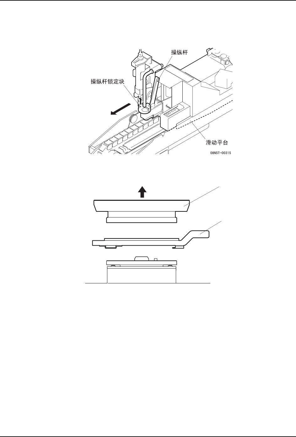 1. 提起操纵杆锁定块,然后握住操纵杆,将滑动平台拉到跟前。