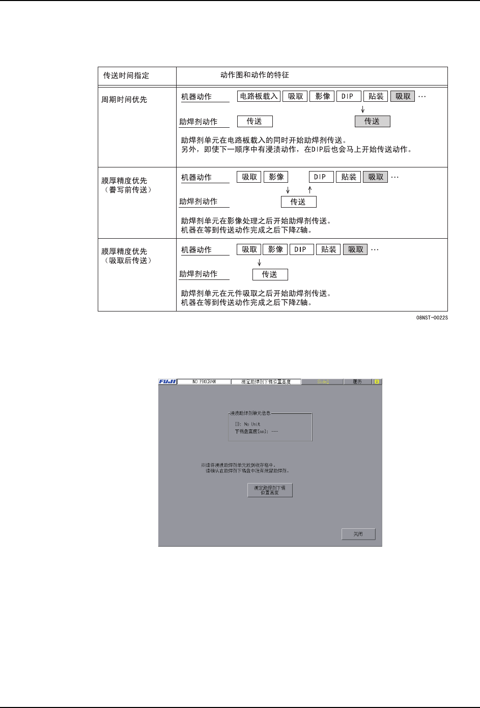 这里,对每个设定的机器动作和助焊剂传送时间进行说明。在设定动作模式时请参考。