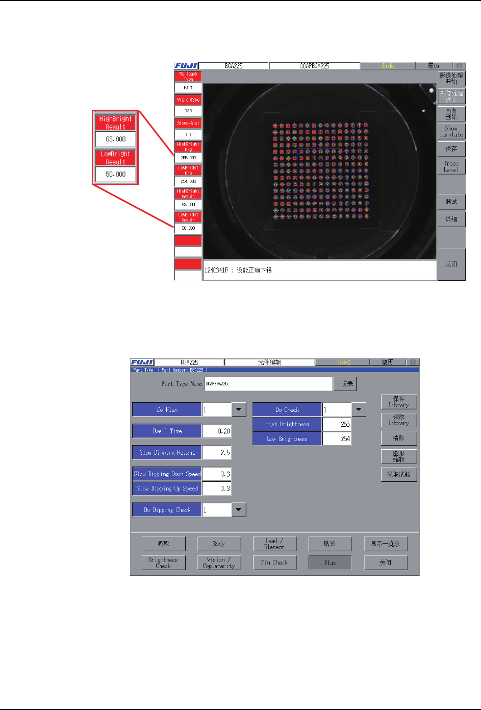 7. 确认下锡 INS-XPFRDF-3.0S 32 XPF 旋转式浸渍助焊剂单元使用说明书 4. 在错误信 息画面的 [H ighBrightResult] 和 [LowBrightR esult] 中, 显 示出每个锡球所测 定的平均亮度的最大值和最小值表 示。请记录下来。 5. 请按下 [ 返回 ]。 6. 对于在 4 中记录的值,请把最大值保证 +15 左右,最小值保证 -15 左右的值做为基准输 入 [High Br ight…