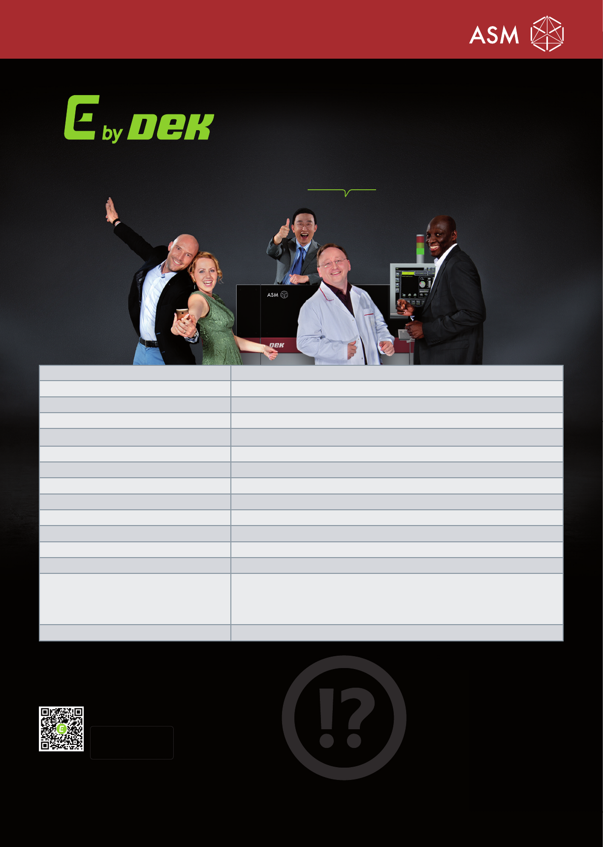 3 LED 配套 印刷超大板,唯有 E by DEK : • 板长最高达 620 毫米 • 重板轨道 • 远程停板器 • 对应长板的钢网清洁装置 ( 600 毫米) 汽车电子配套 由 E by DEK 确保高品质: • 焊盘锡膏覆盖率检查 • 进阶统计制程管制 • 焊膏滚动高度监测器 模组配套 独特于此级:迎合柔性板的 E by DEK • 软板印刷 • 侧夹 • 双速轨道马达 • 可调宽度钢网定位装置 • 半自动钢网装置 E- 配套 …