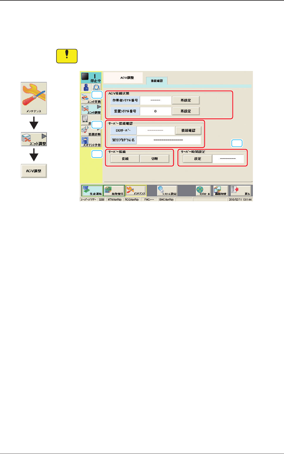 OM-1615 16 1 101-003 7.2 ACV 調整 7.2.1 接続確認 注 意 装置と ACV システムとの接続状態を確認、 再設定するためのシートです。 通常は使用しないでください。 [1] [2] [3] [4] F5 [1] ACV 接続状態 作業者シリアル番号または装置シリアル番号が正しいか確認します。 [ 再設定 ] ボタンを押すことにより ACV サーバと通信します。 [2] サーバー接続確認 DB サーバ状態…