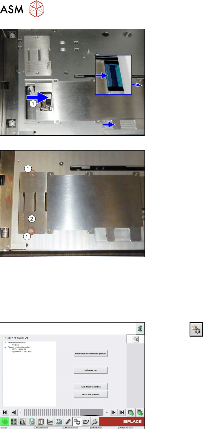 2 General Tasks 2.1 Hardware Tasks Service Manual SIPLACE JTF-ML2 08/2017 31 Fig.17: Mounting the Transport 5 ► (1) Insert the conveyor. Make sure that it fits cor- rectly into the conveyor pivot. ► (2) Swing the transp…