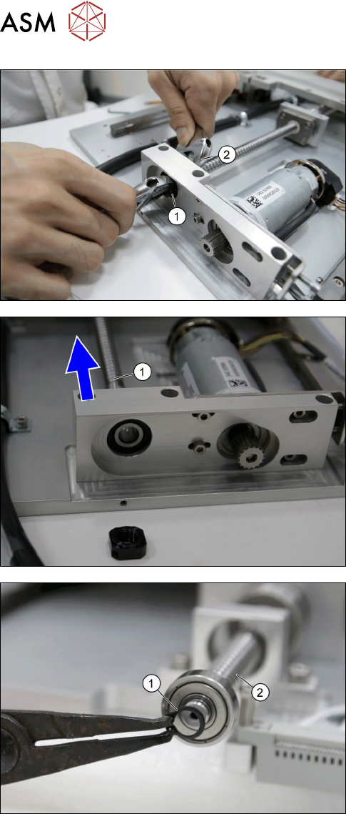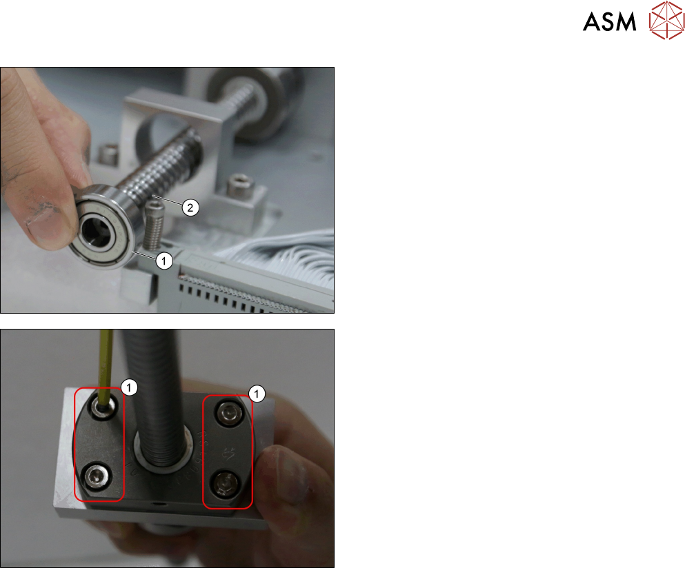 3 Tower Mechanics 3.4 Replacing the Ball Screw 44 Service Manual SIPLACE JTF-ML2 08/2017 ► Remove the Bearing Lock Nut M10x1 [03134432-xx] (1) with a wrench (2) . ► Push the ball screw (1) upward. ► Remove the C-clip siz…