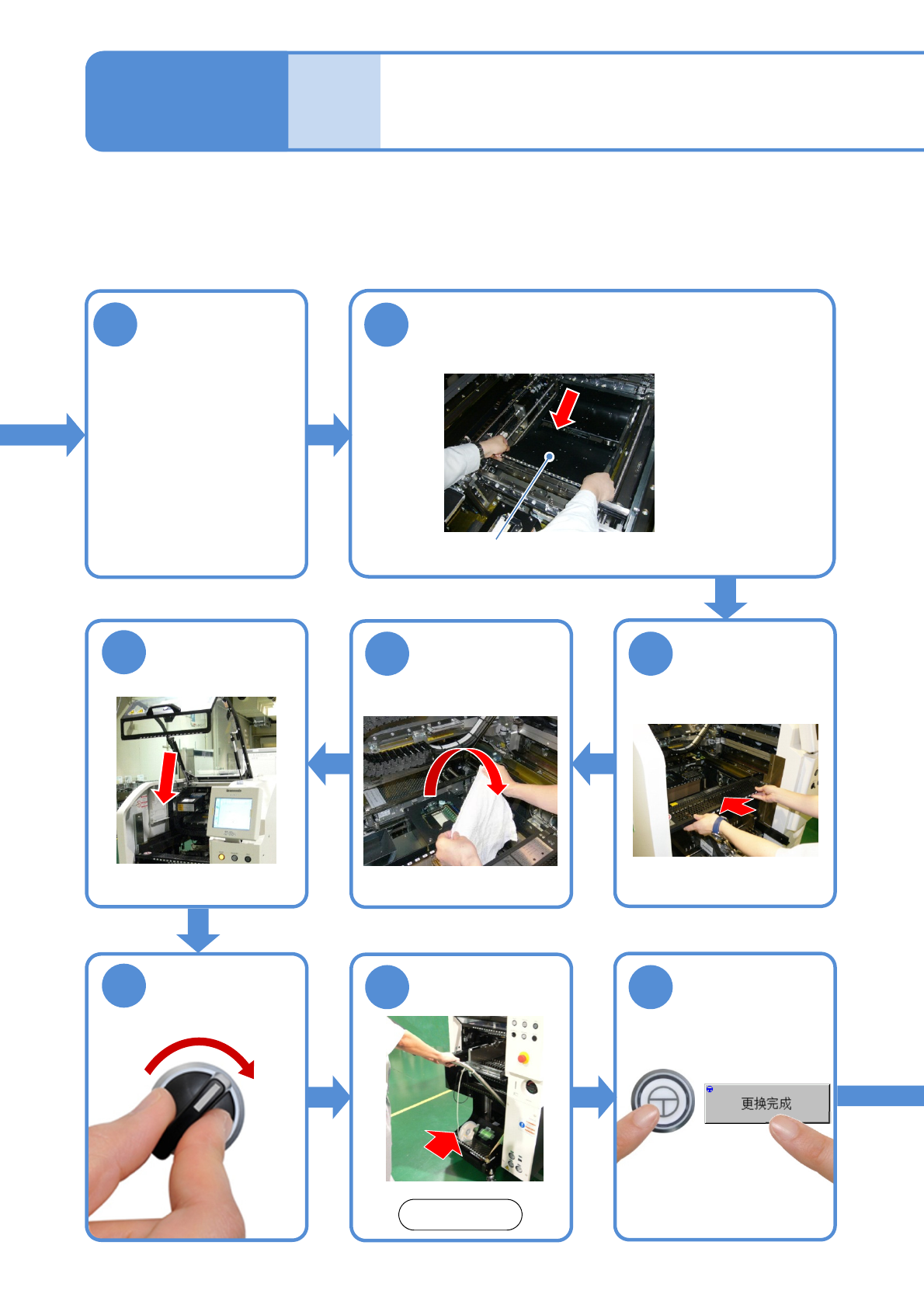 NPM-D3 EJM6DC-MB-05M-07 卸下交换台车 ( → P.3-2) 前侧 5-3 -2 每 1 4 0 小 时 保 养 定 期 检 查 ENABLING 1 ENABLING ( 基板支撑块上升 ) 2 确认提示 3 用棉纱布盖在 多功能识别照 相机上 顺序 9 卸下基板支撑块 ●请注意不要在多功能识别照 相机 (LED 照明 ) 上掉落物体 或者撞击。 ●当在基板支撑块上存在支撑 销时,请小心不要掉落。 基板支撑块 O…