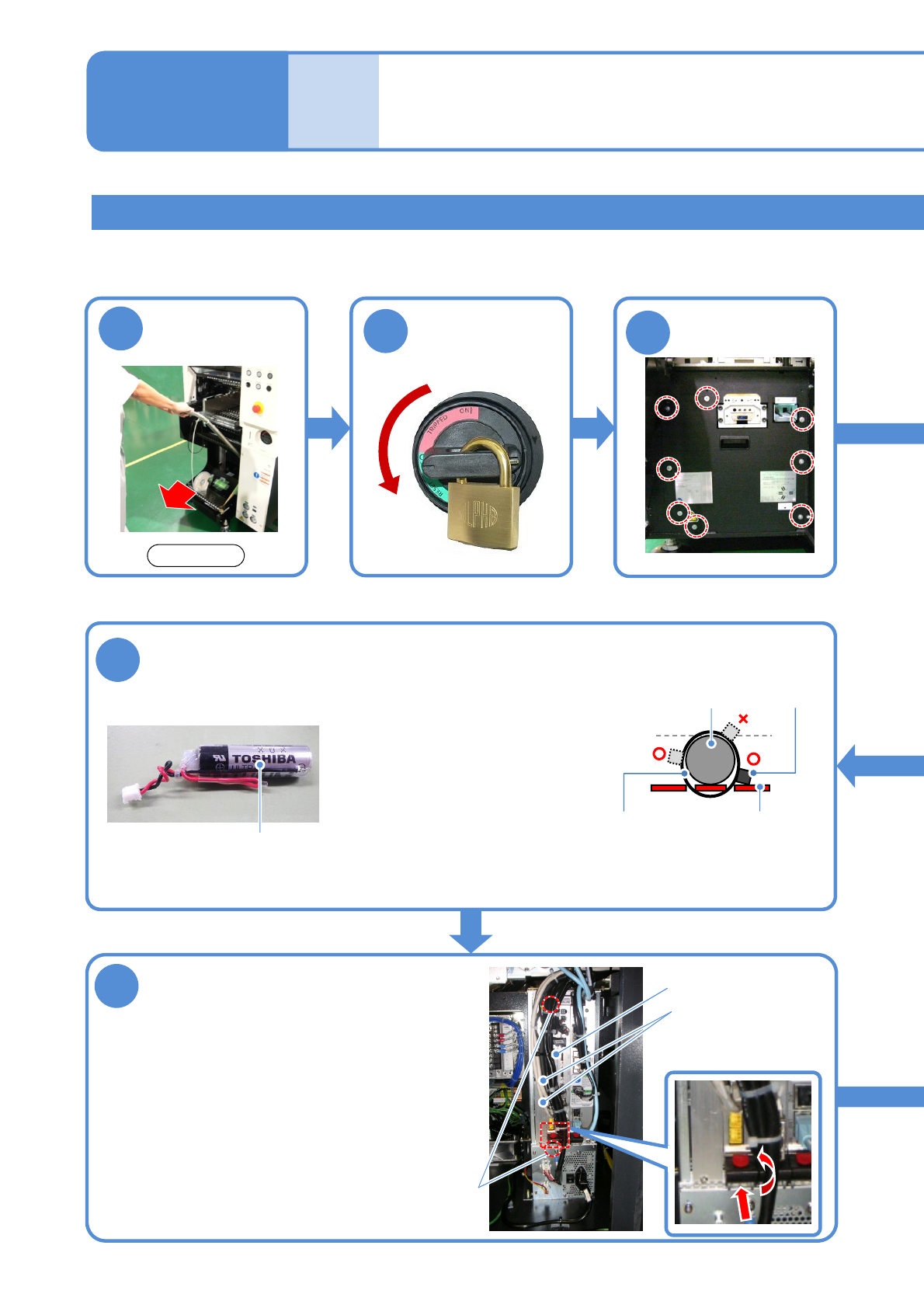 NPM-D3 EJM6DC-MB-12M-09 NCIO 板 4 ●卸下电缆。 ●卸下固定 NCIO 板的螺丝。 ●按下板下部杆的按钮 (PRESS) ,同时往下推杆, 拉出 NCIO 板。 卸下 NCIO 板 12-3 -6 螺丝 (2 个 ) 5 卸下蓄电池盒 ●卸下连接器。 ●切断捆扎线 (2 处 ) 。 捆扎线 连接器 电缆 9 ON 10 8 安装安全盖 解锁 安装交换台车 ( → P.3-2) 前侧 ● 8 个螺丝