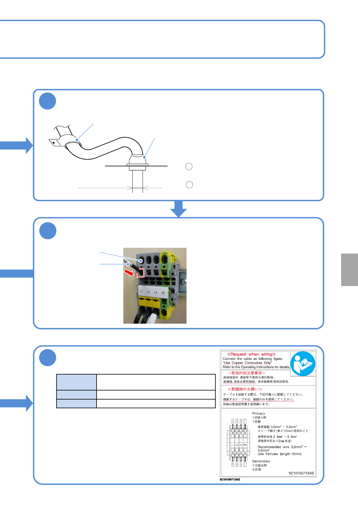NPM-D3 EJM6DC-MB-14M-06 电缆 夹具 A 14-4-2 -2 3 按照电缆夹具 A 、 B 的顺序插入电缆 4 插入专用螺丝刀 电缆插入口 专用螺丝刀 电缆 夹具 B ●推荐电缆外形尺寸 :13.5 ~ 18 mm ●电缆不易插入电缆夹具 A 时, 逆时针方向旋转拧松。 ●电缆不易插入电缆夹具 B 时,卸下螺栓, 插入电 缆后再拧紧螺栓进行固定。 插入电缆后,电缆夹具 A 以顺时针方向 旋转,固定电缆。 必须以 1…