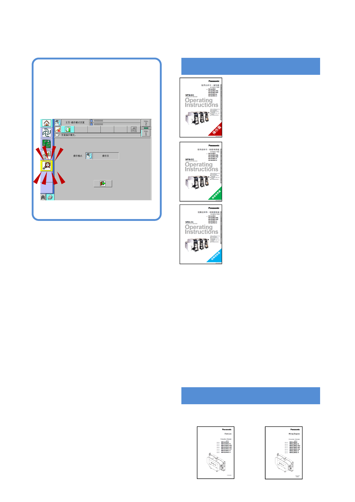 NPM-D3 EJM6DC-BP-03N-02 S-7 通过触摸屏的绿色闪烁 通知定期检查时期! ( 经过一个周期的 80 % 时 ) 使用说明书的构成 其他附属品 准备和使用方法 ■操作篇 从材料设置等生产准备, 到数据 设定、修改方法的所有操 作方法, 请参考此说明书。 必需的检查和清扫 ■维修保养篇 维修保养篇的记载内容有 ,必需 进行的定期检查、调整、 清扫内 容和消磨品的更换 。 发生故障时 … ■故障排除篇 故障排除篇的…