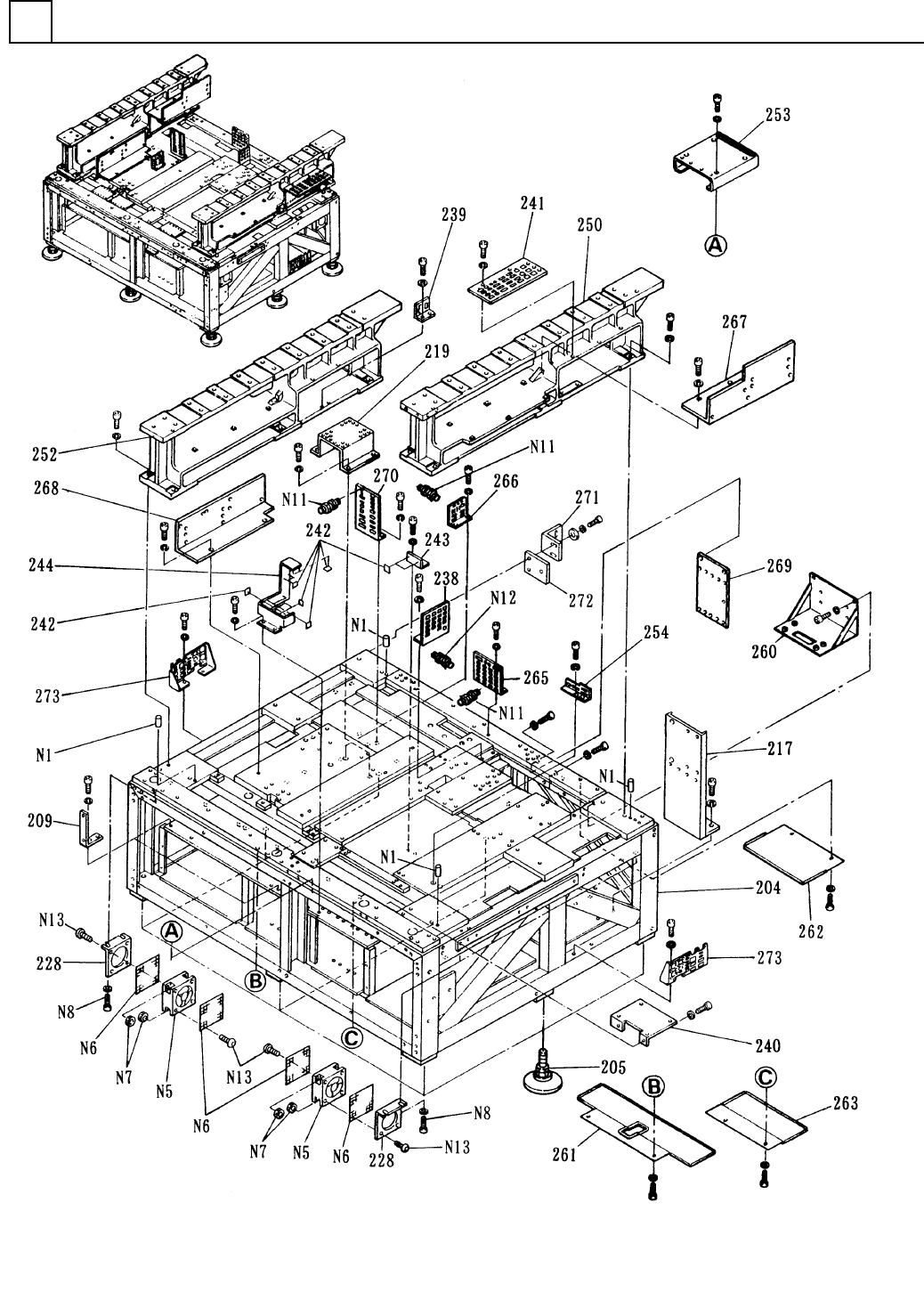 イラスト No. REF No. PART No. PART NAME REMAR KS Q'TY 1 本体部 MAIN BODY S ECT. 部 品 名 品 番 個数 備 考 1 1045901200 MAIN BODY UNI T ホンタイユニット 204 1 104590120402 MAIN FRAME フレーム(メイン) 205 8 104388951001 ADJUSTING BOL T アジャストボルト 2…