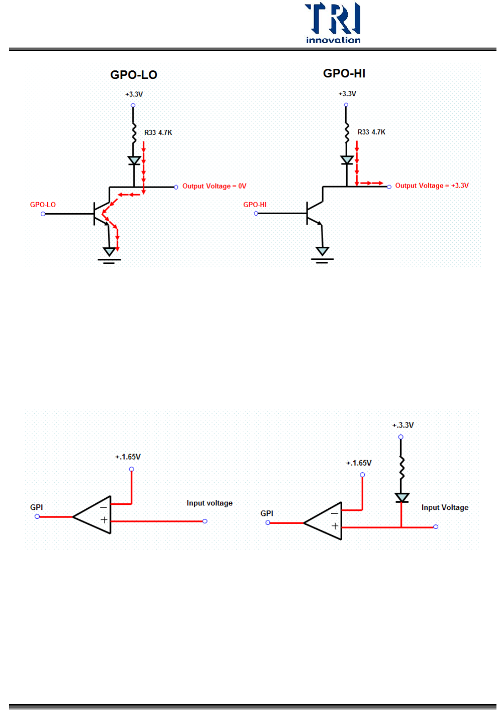 Test R esearch Inc. TR518 SII 使用手冊 --- 硬體 規格與架構 25 GPI 功能解釋 倘若沒有 3.3V 的存在, 當 GPI 沒有連接任 何的元件時, 會是浮接的狀態 , 此時無 法確定輸入電壓 會是 High 或者是 Low ,因此 有可能會 造成 Comparator 發生誤動作 的機會。 GPI 的作用如下 : 倘若輸入電壓小 於 1.65V 時, GPI 判斷為 Low; 倘若輸入電壓大 於 …