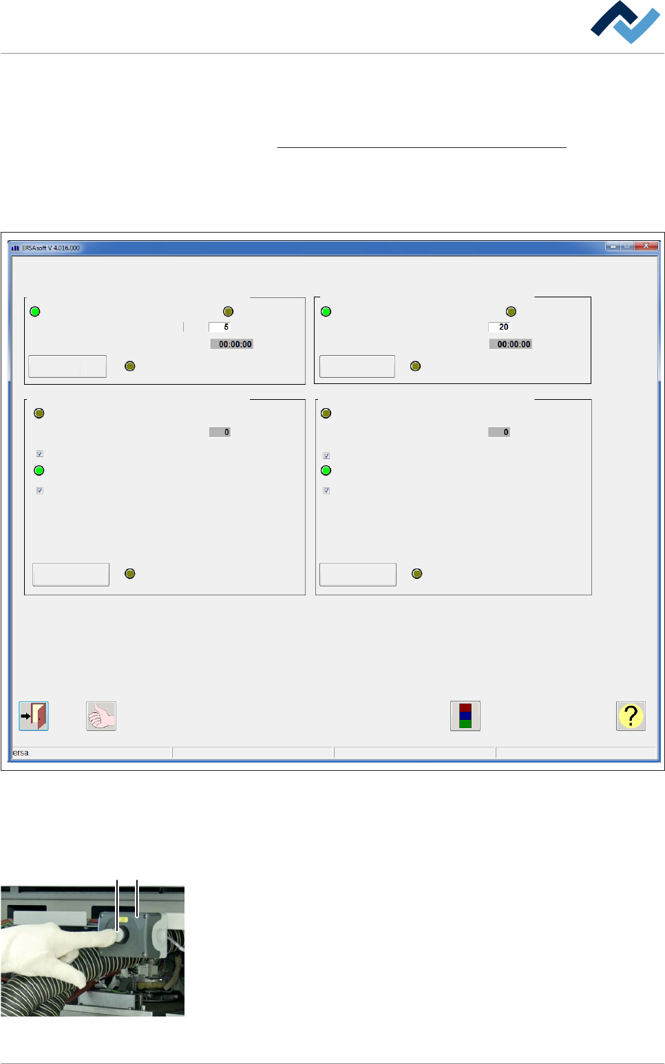 Abb. 154: Manejo de las llaves de cierre. La ilustración inferior muestra la caja de limpieza de gas de procesado por detrás
