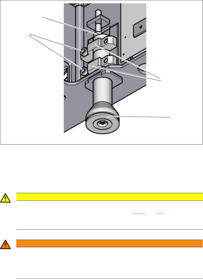 继续小心地下放贴片机,直到贴片机外部支脚接触到高度调整 M24x2x120 设置螺丝 (第