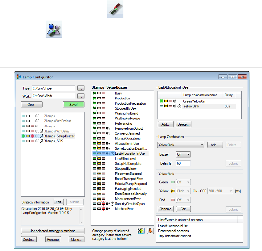使用说明书 SIPLACE CA4 V2 5 贴片机上的作业 使用软件版本 711.0 或更新 2019 年 2 月版 5.7 带蜂鸣器的指示灯 195 5.7.2 指示灯自定义配置 点击工作站软件工具栏中的 “ 设置 ”。 点击 “ 用户 ”。 转至 指示灯自定义配置 并点击 配置 ... – 此时将启动 灯配置 工具。 图 5.7 - 1 灯配置工具 此工具用于根据具体的应用案例 调节指示灯设置。指示灯和蜂鸣器信号可单独…