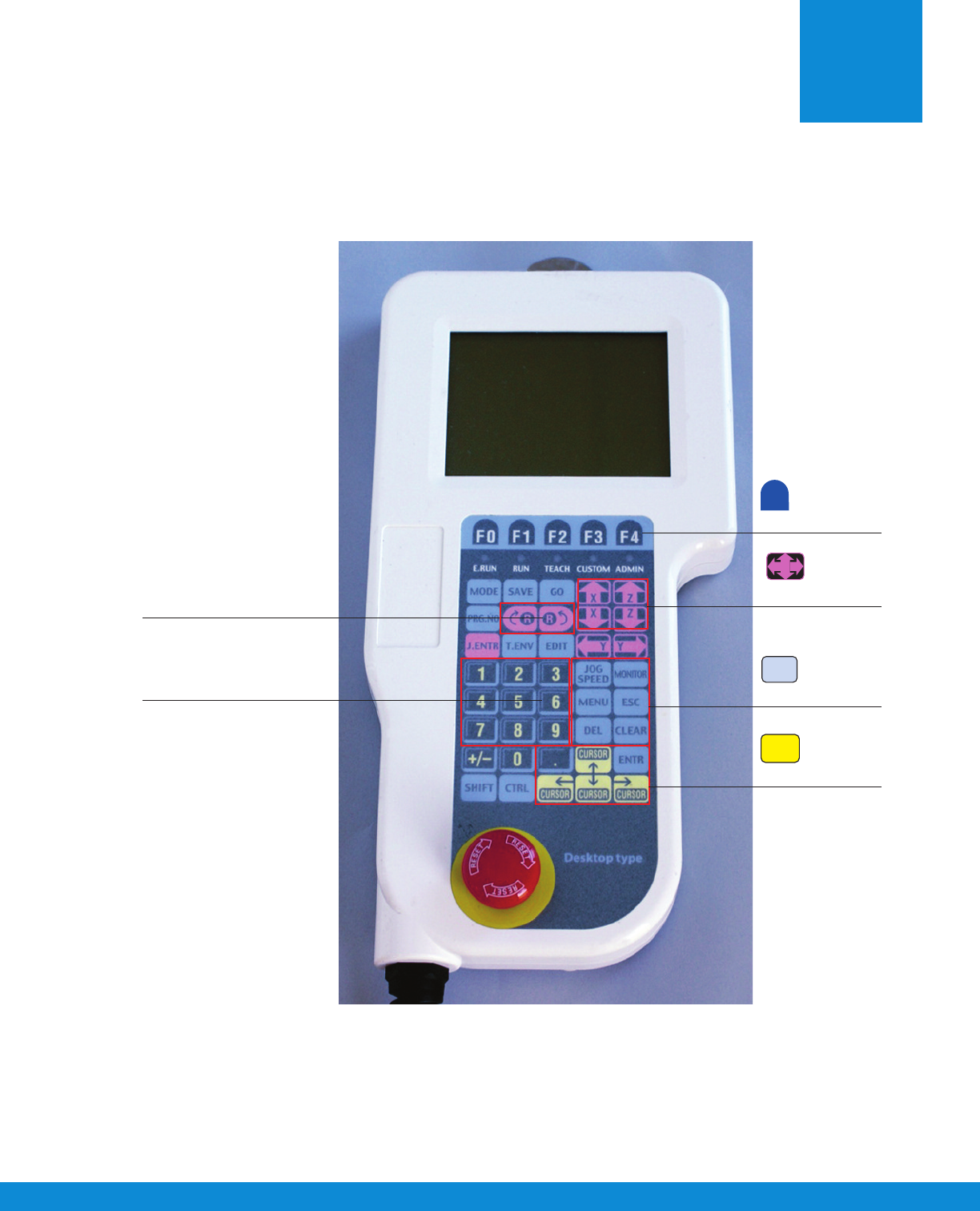 注意: 在使用坐标键的时候,请时时注意平台的运动曲线,教导盒上的x,y,z显示数据可