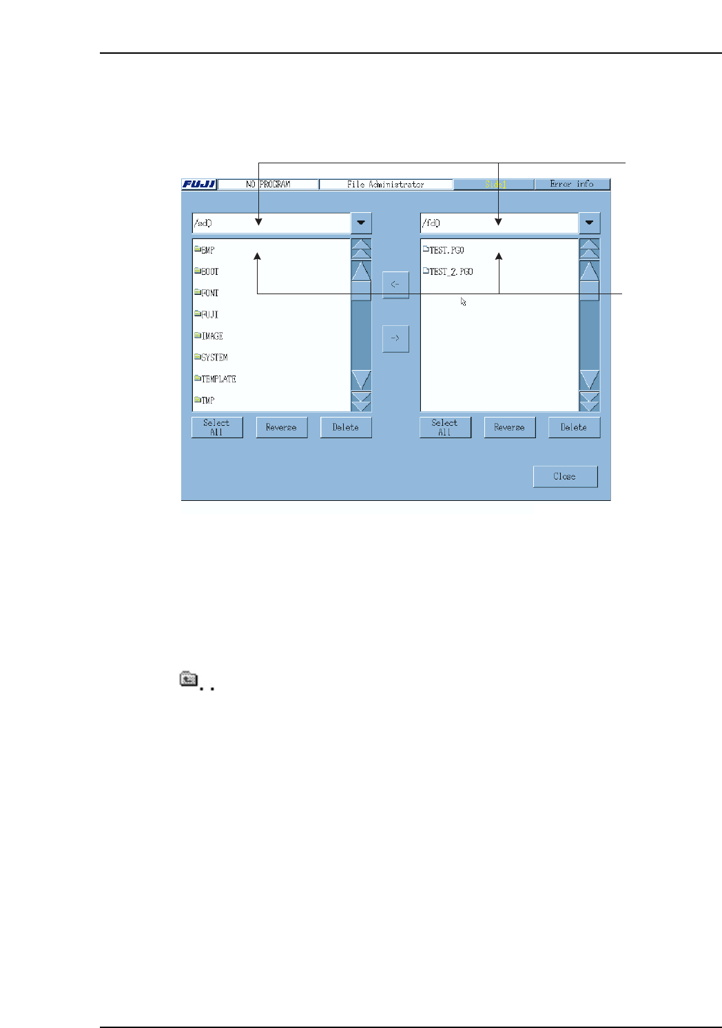 <Copying a Machine File to a Floppy Disk> 6. Select the file to be copied from the list in the right pane (more than one file may be selected). 7. Press the [ ← ] key to copy the selected file to the floppy disk. A…
