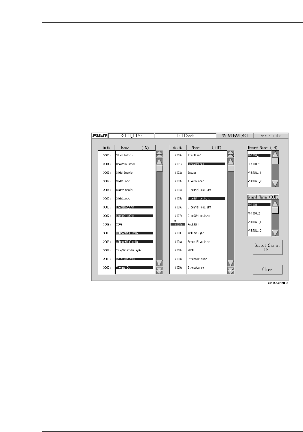 The I/O Check screen is used to monitor input/output signal statuses. Lamps and air