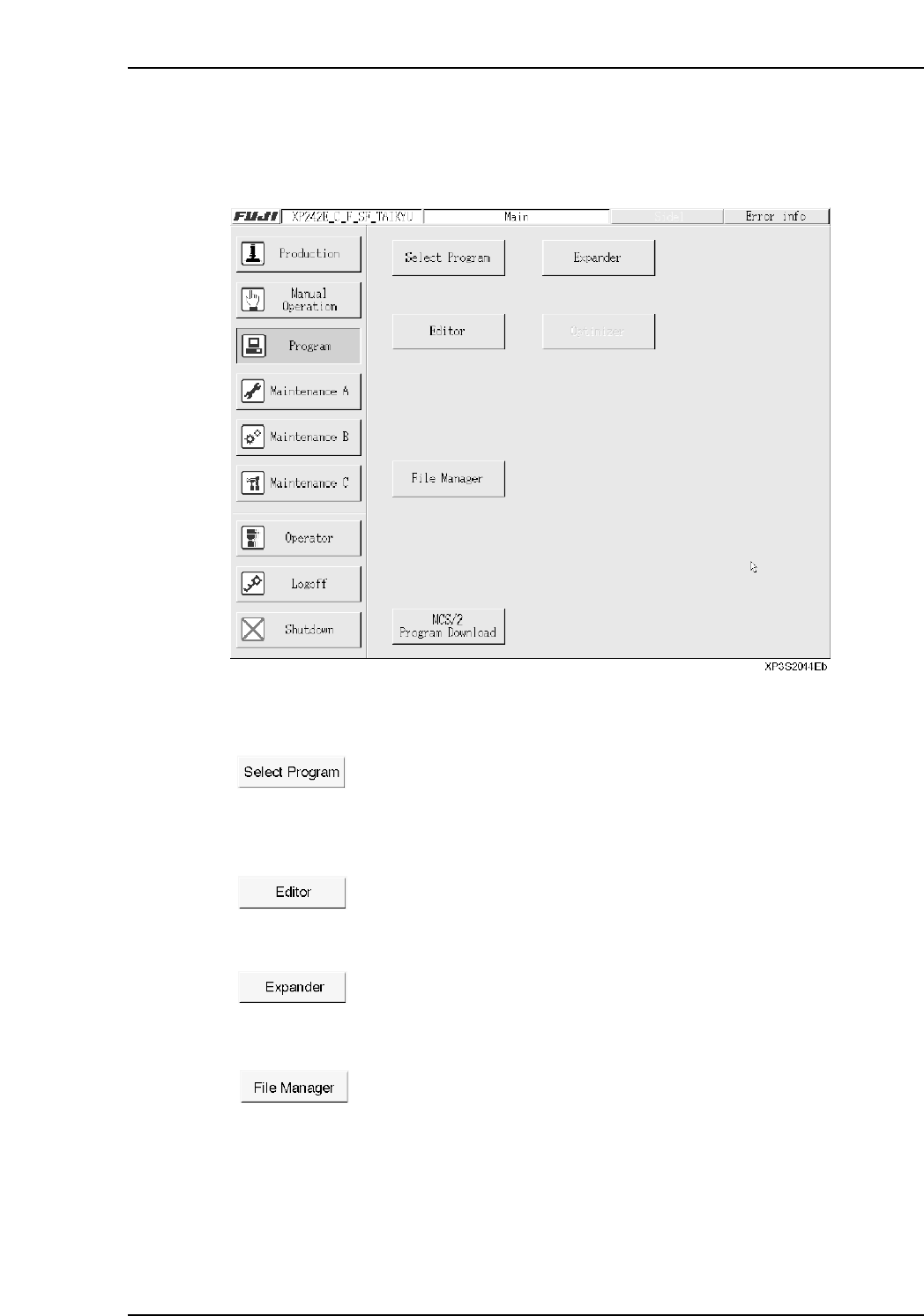 The XP program menu is shown below. It is displayed by pressing [Program] at the [Main] screen.