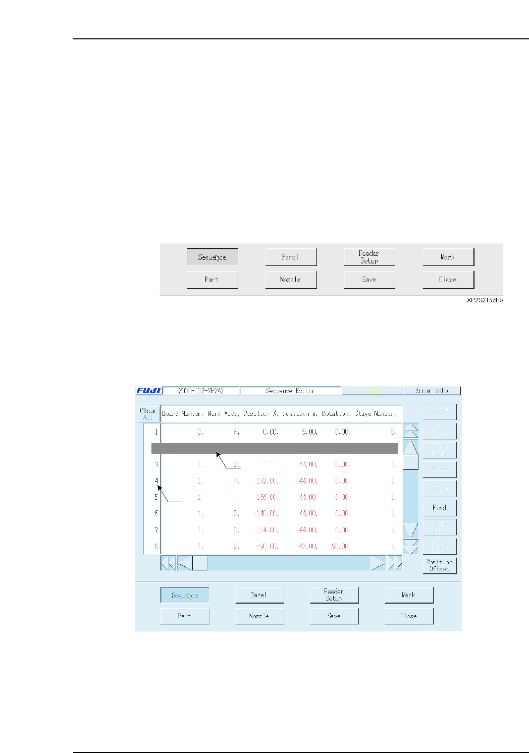 This screen is used to edit sequence, panel, feeder setup, mark, part, and nozzle data.