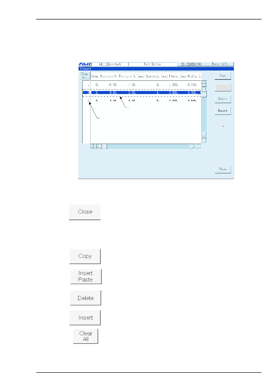The following buttons apply to the line which has been selected in the selection area at