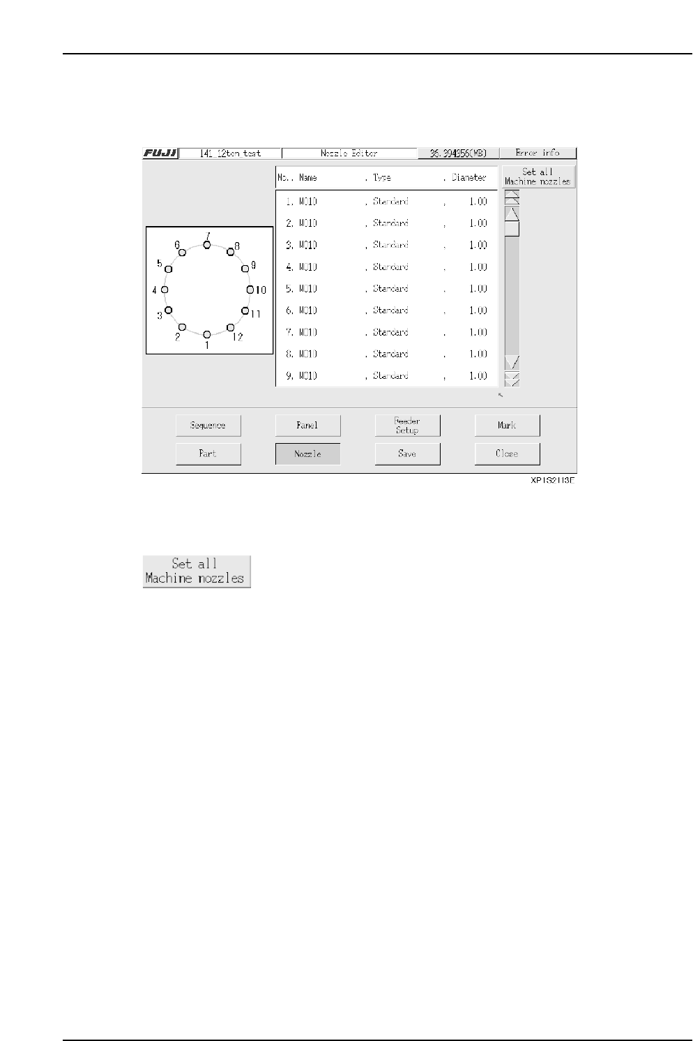 Part 3 Chapter 3 Editor Edition 2.0 3-3-38 XP-142E System Reference 3.7 Nozzle Editing (ESR0709d) This editor is used to edit nozzle assignments. Operation Button Explanations Press to perform batch reading of the machin…