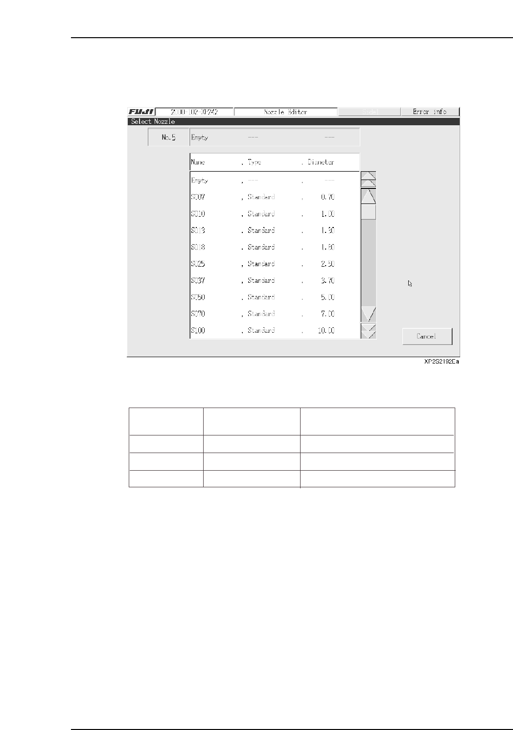 3. The nozzle “Name” appears as “Empty” when no nozzle selection is made.