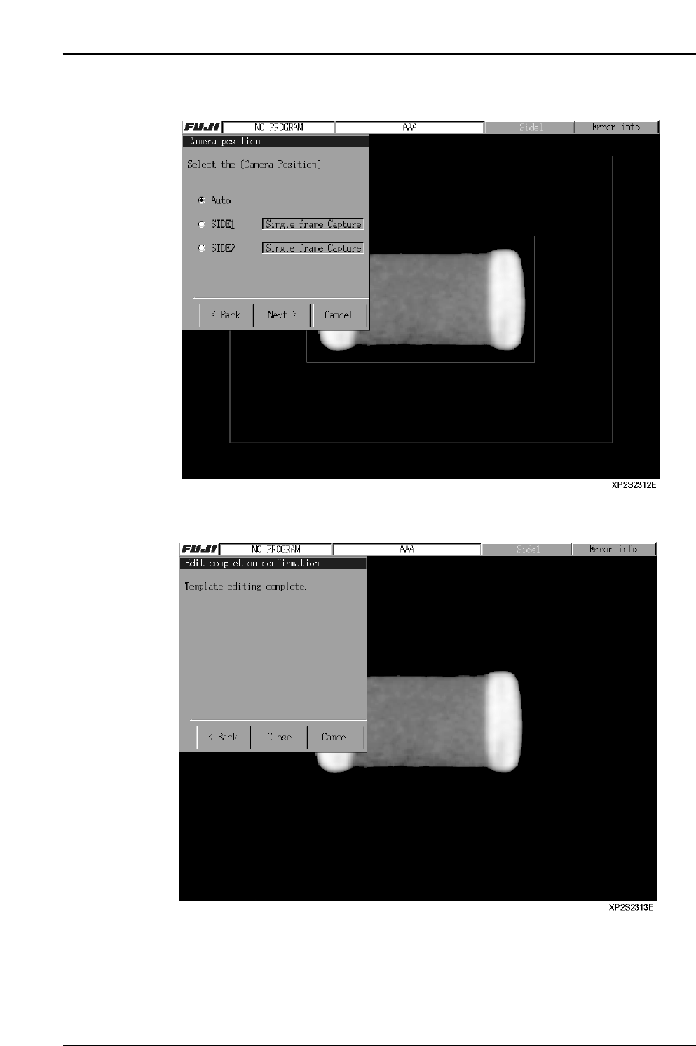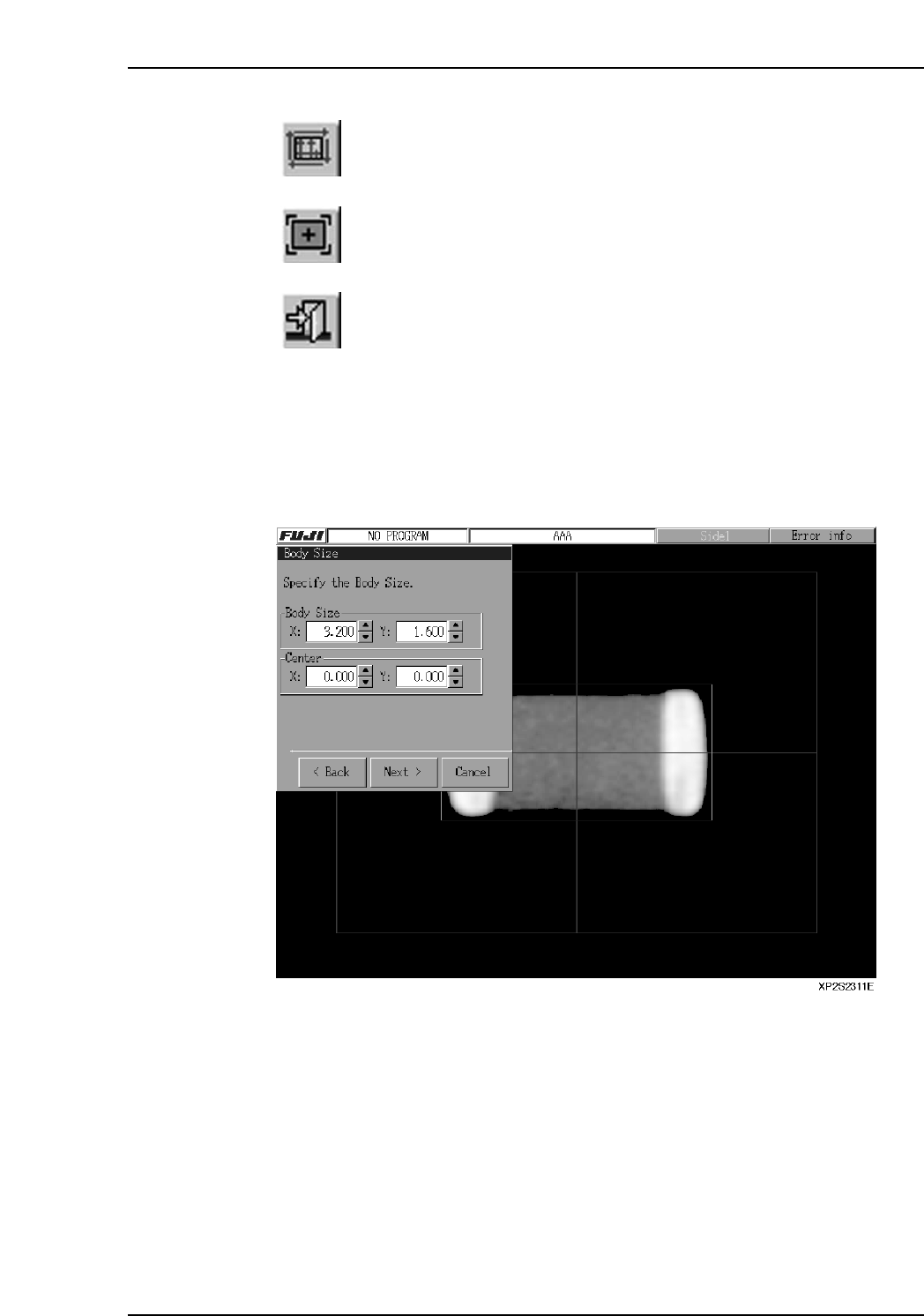 16. Select the inspection line display mode, then draw seek lines at the required points. After drawing the seek lines, repeat the edge position correction operation (see above). 17. Select the image position correction …