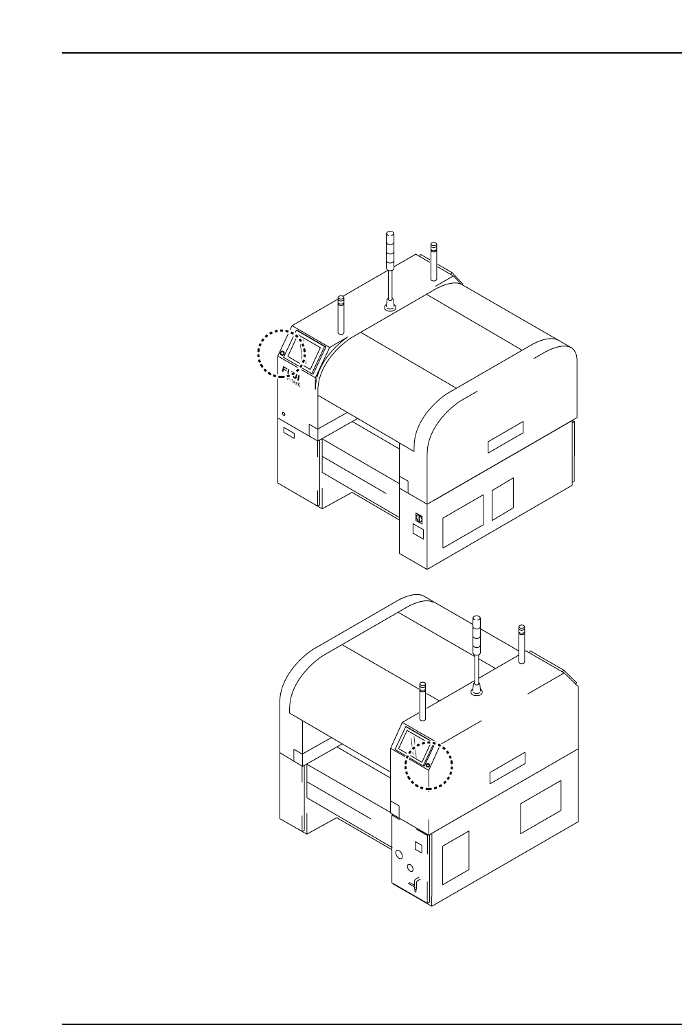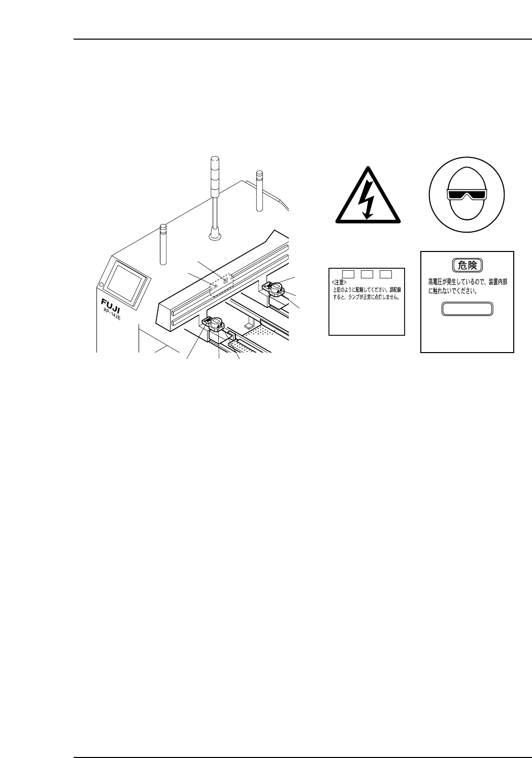 5. The EMERGENCY ST OP Buttons (ESG0701a) In the event of an emergency, press any of the red EMERGENCY STOP buttons located on the machine at the positions indicated in the figure below. XP1MZ011E Front View (Side 1) Bac…