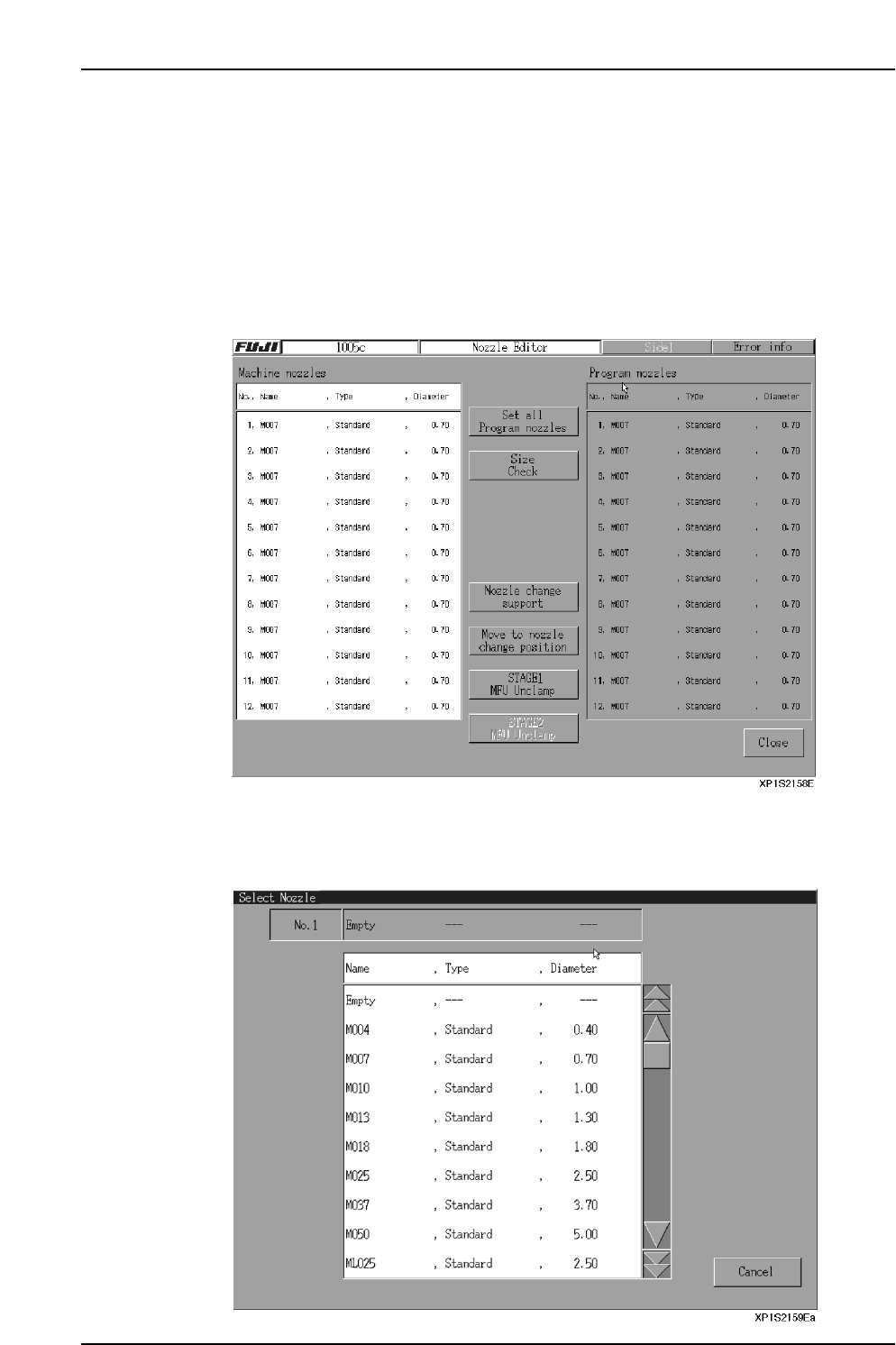 [Nozzle Editor] screen. This screen contains lists of “machine nozzles” and