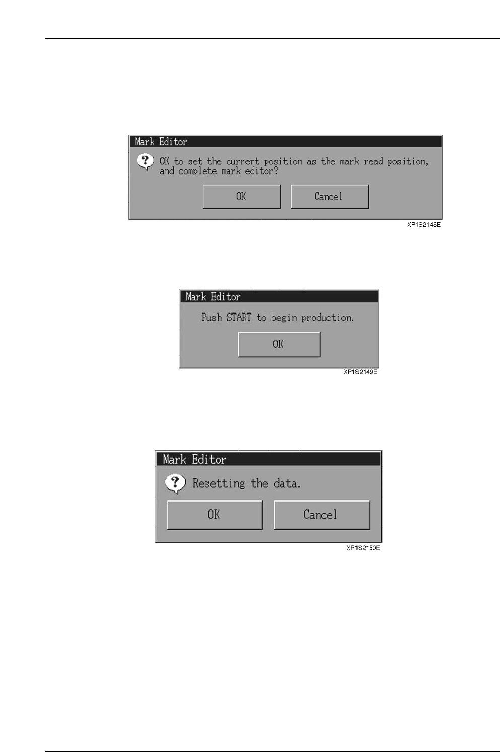 5.3.4 Using the Mark Editor Buttons (1) Center Set Button Press the [Center Set] button at the mark editing screen to display the following dialog box. Press [OK] to set the mark position and end mark editing. Press [Can…